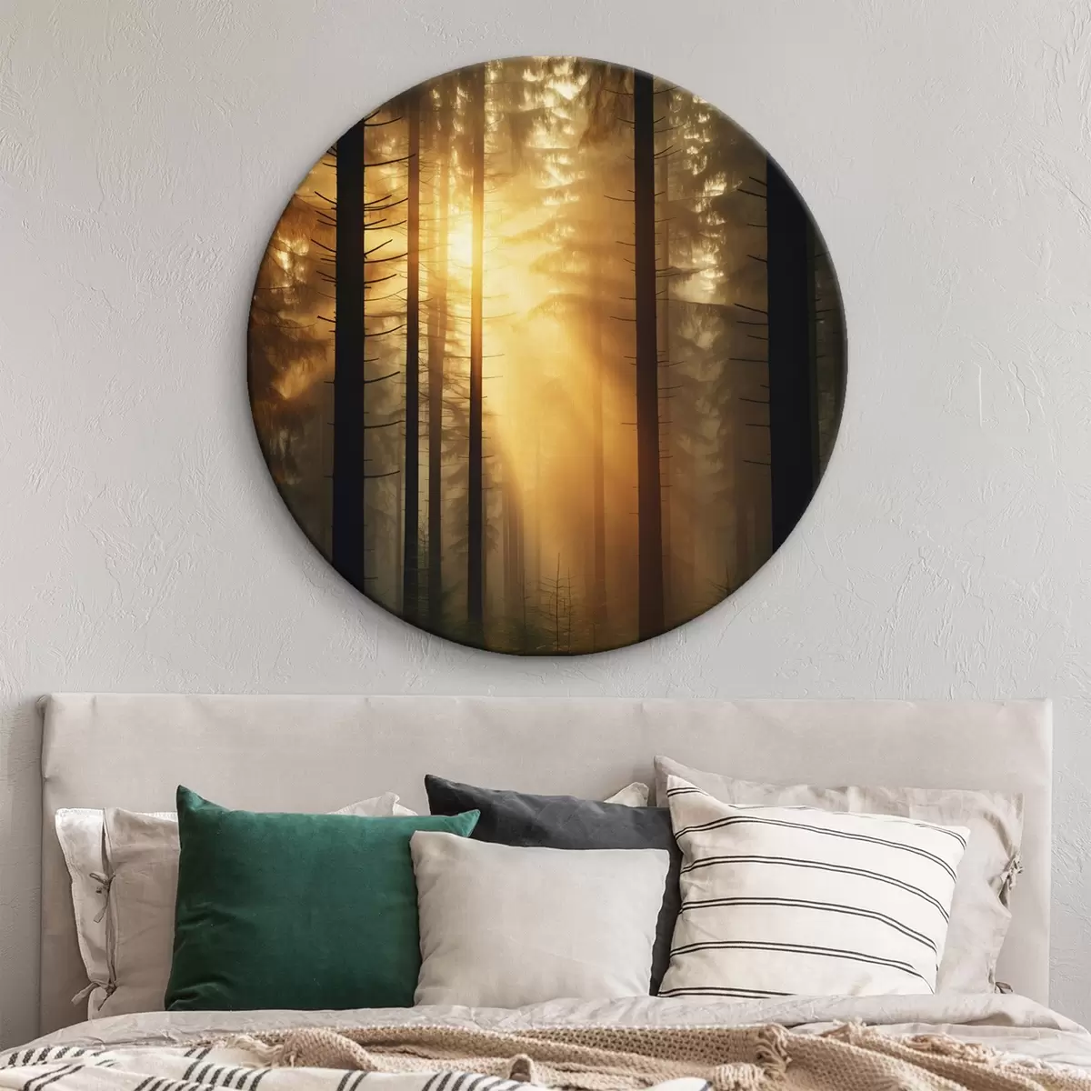 Okrągły obraz Gęsty las sosnowy w świetle zachodzącego słońca, realizm, natura Nr r44615