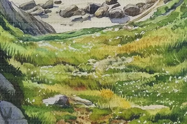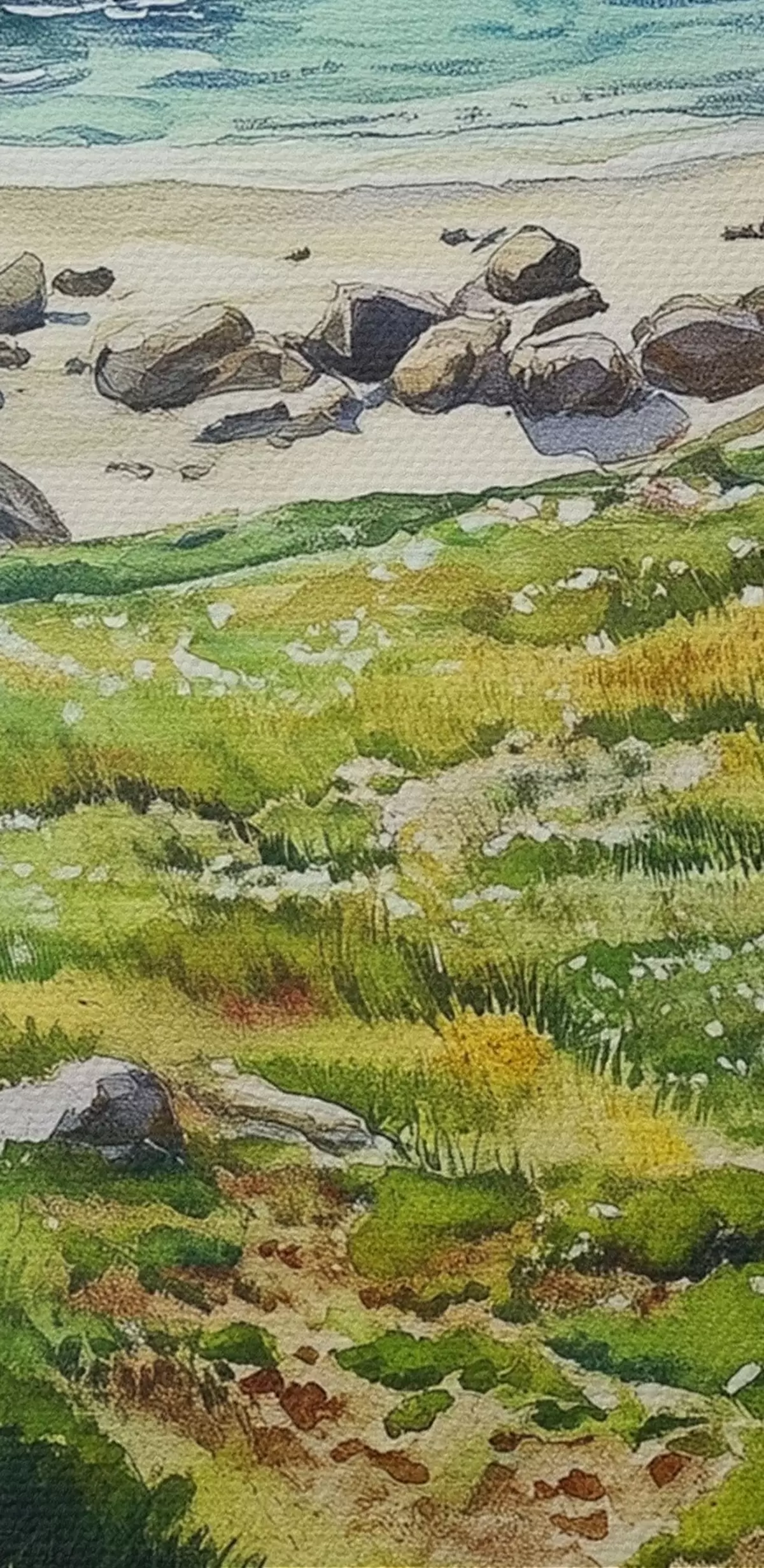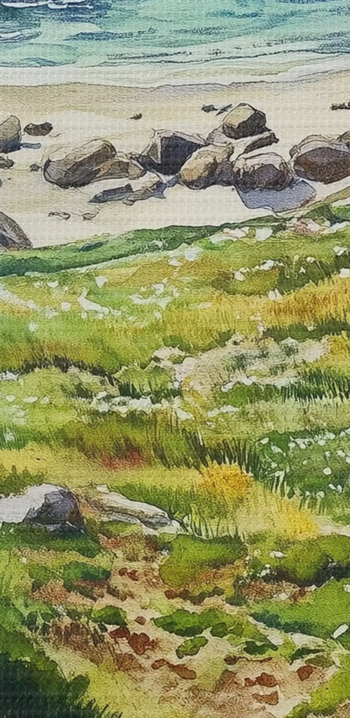 Okrągły obraz Wybrzeże morskie ze skałami i zieloną trawą, styl akwareli, lato Nr r44616