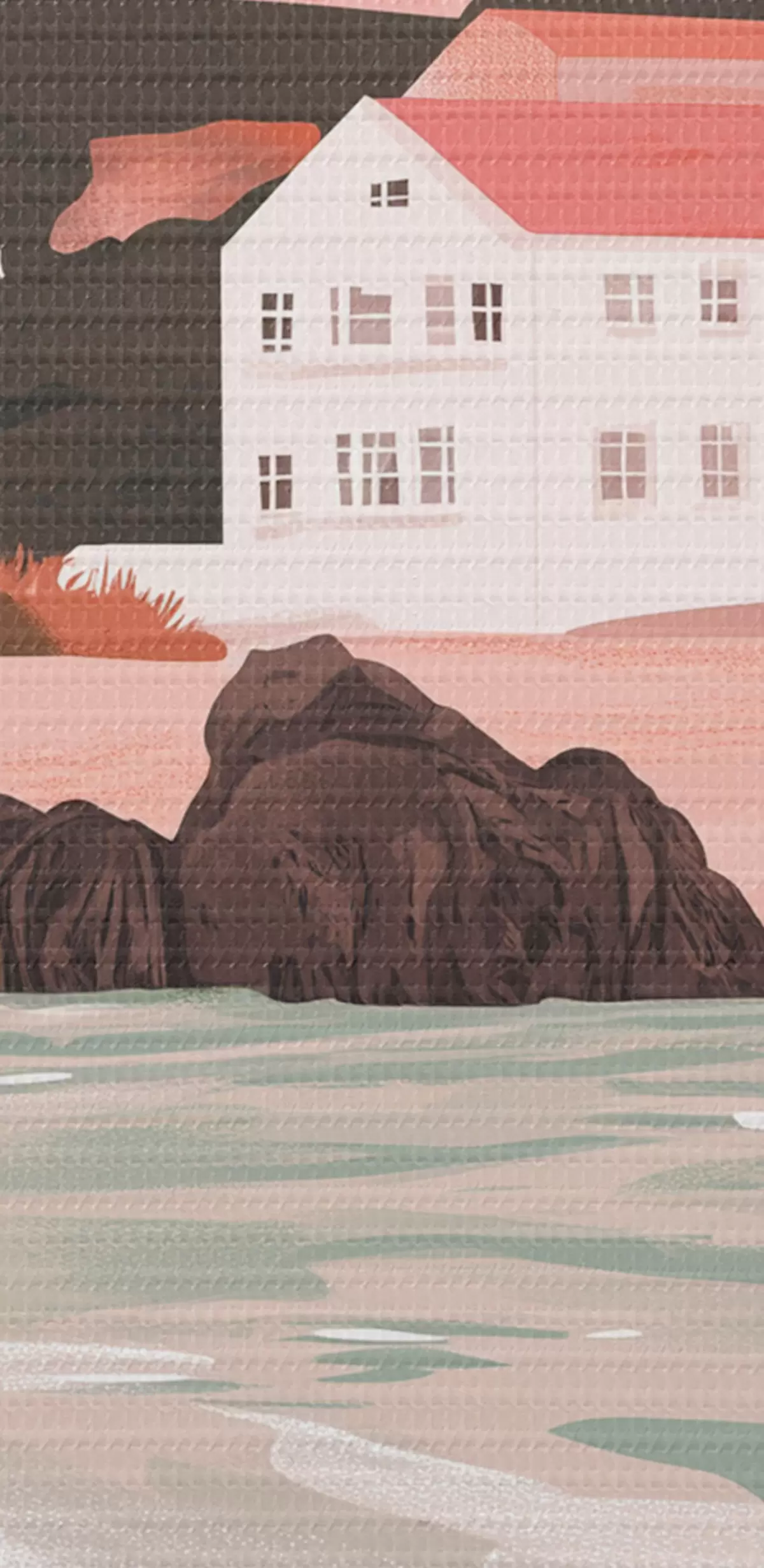 Okrągłe obrazy Przytulna różowa plaża z białymi domkami i muszelkami r44713