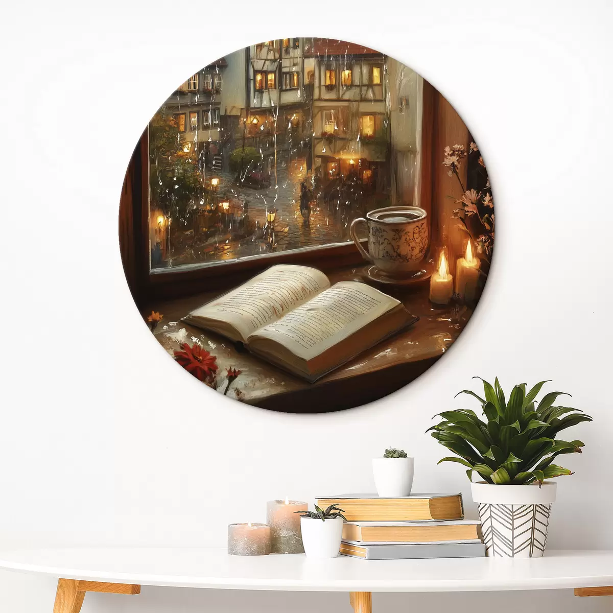 Okrągły obraz Książka na parapecie, świece, deszczowy dzień, przytulnie Nr r44722