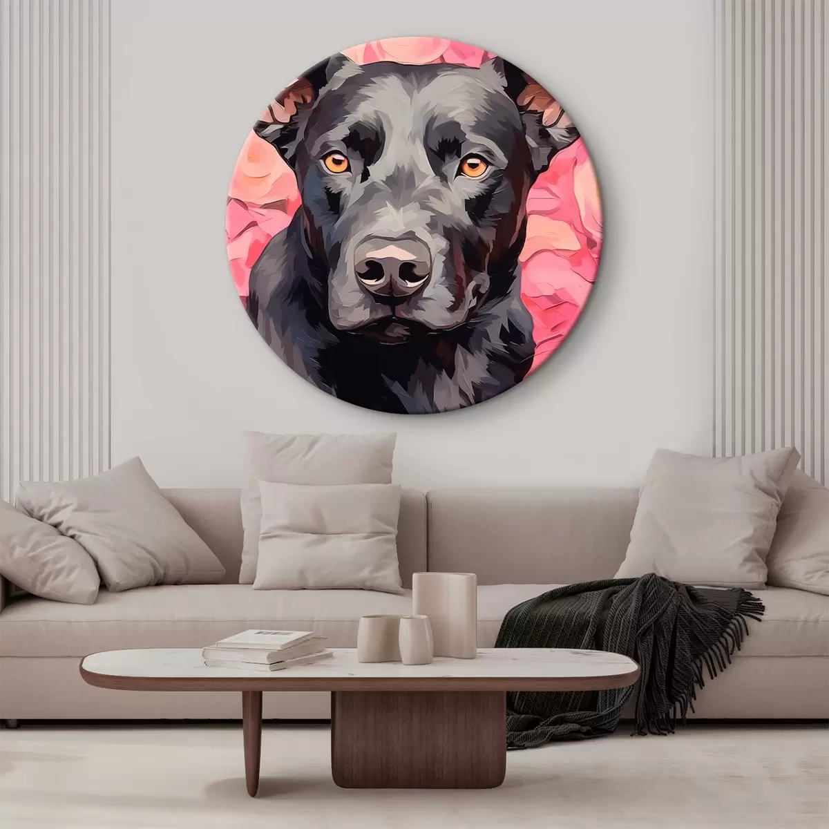 Okrągły obraz Czarny pies na abstrakcyjnym tle róż Nr r44817