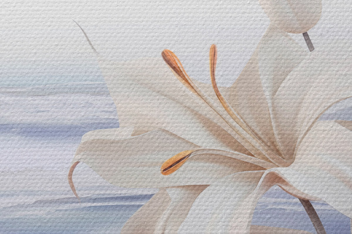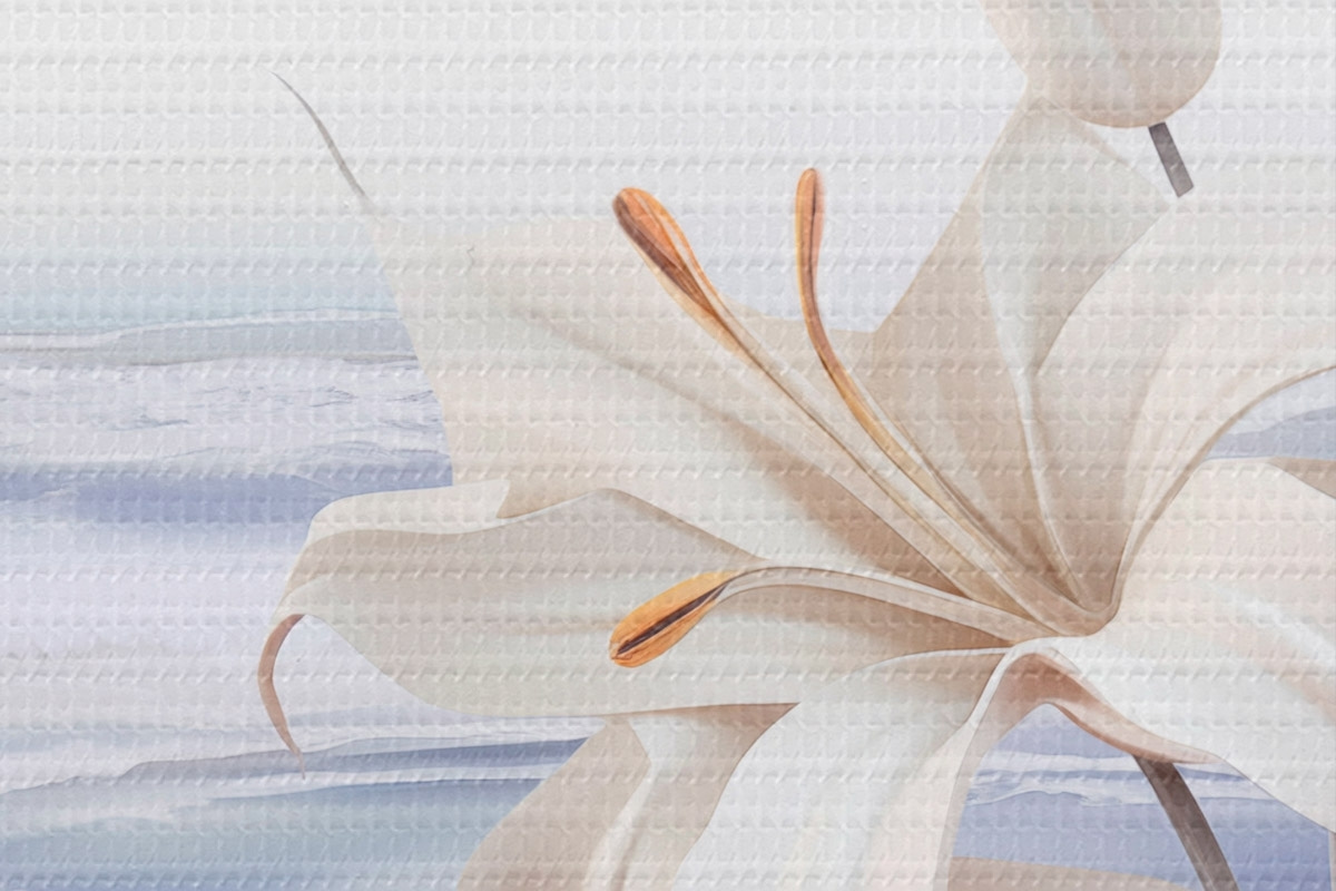 Okrągłe obrazy Białe lilie z pomarańczowymi słupkami i długimi liśćmi na plaży z miękkimi falami w tle, pastelowe kolory r44850