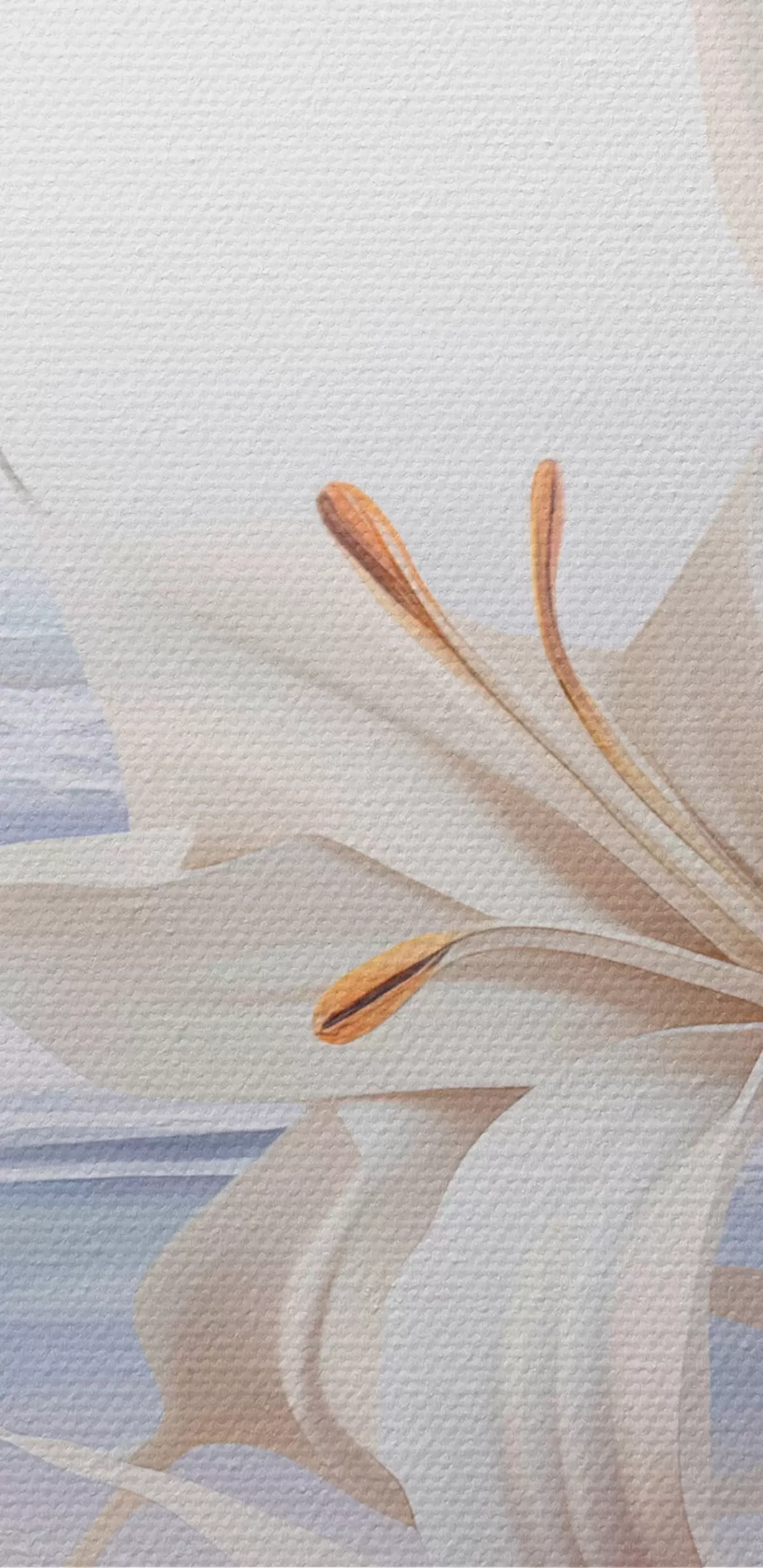 Okrągły obraz Białe lilie z pomarańczowymi słupkami i długimi liśćmi na plaży z miękkimi falami w tle, pastelowe kolory Nr r44850