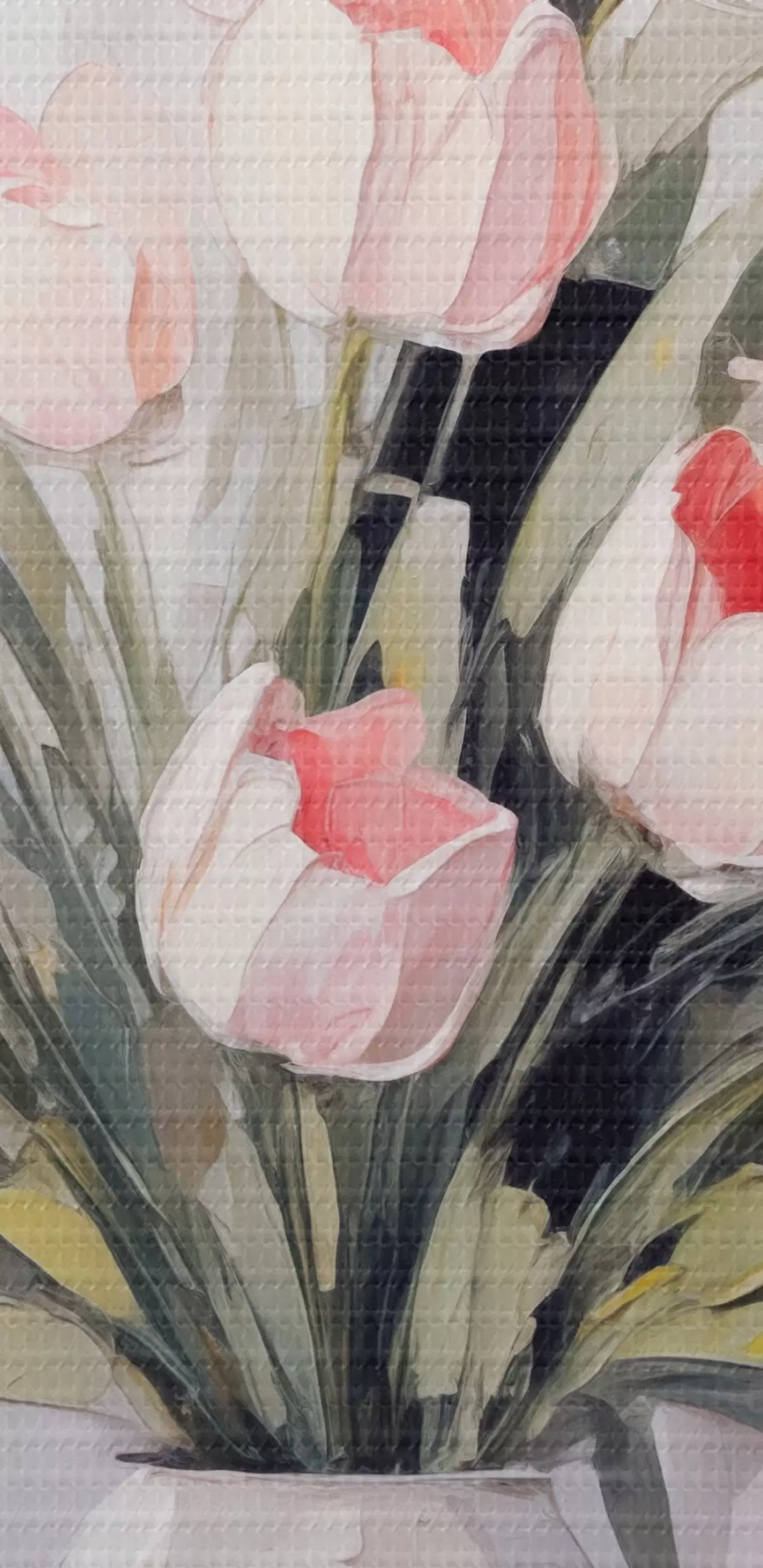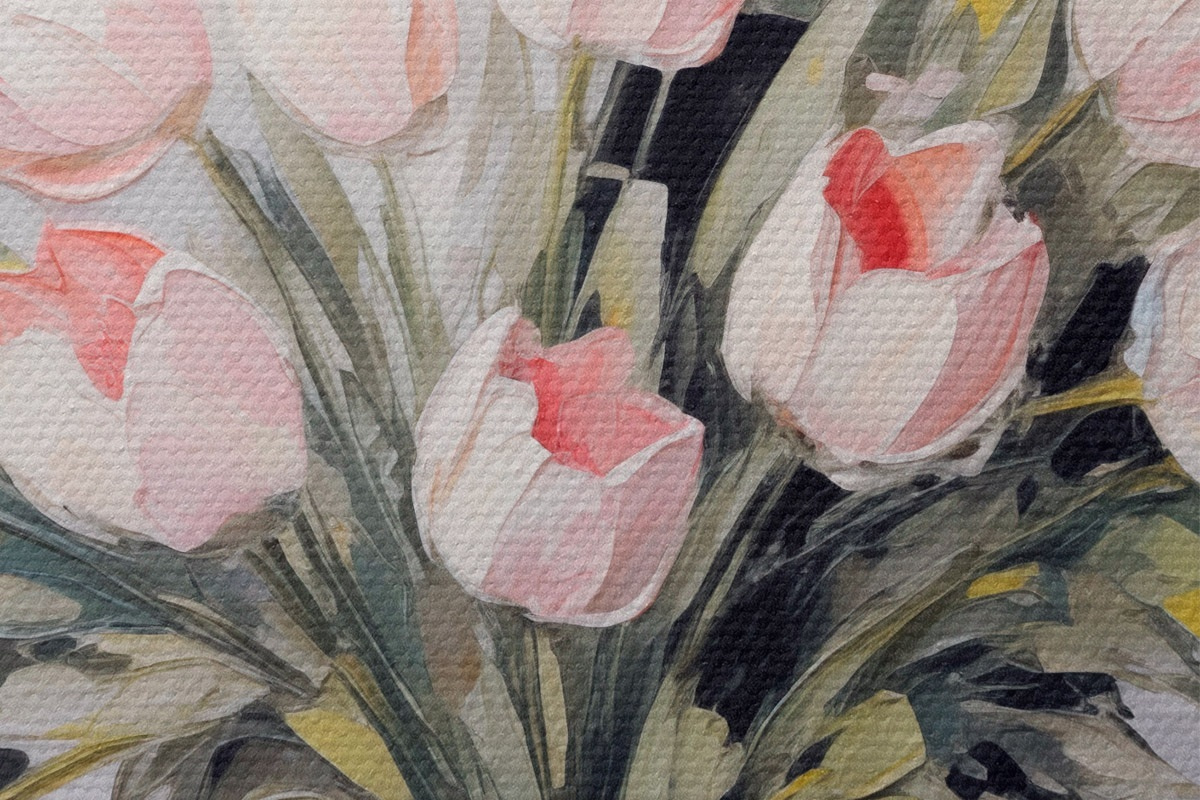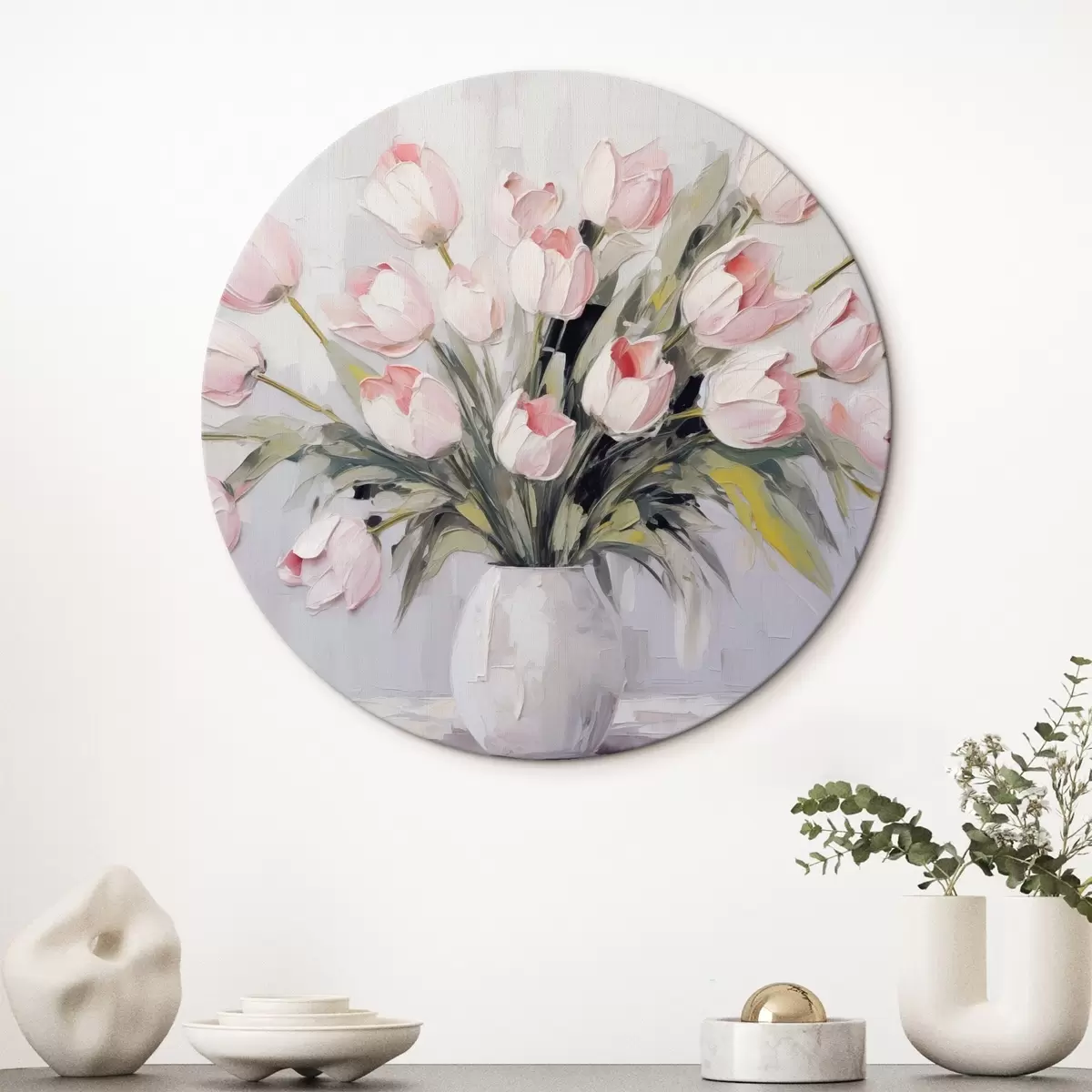 Okrągły obraz Wazon z różowymi tulipanami, zielone liście, jasnoszare tło, styl malarstwa olejnego, grube pociągnięcia pędzla Nr r44852