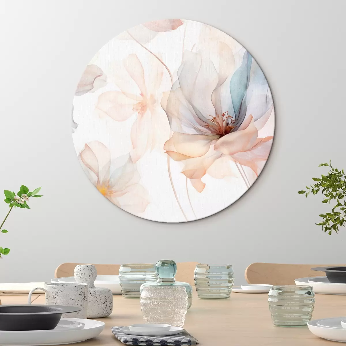 Okrągły obraz Półprzezroczyste teksturowane kwiaty w pastelowych kolorach, delikatne płatki, delikatne linie na białym tle Nr r44855