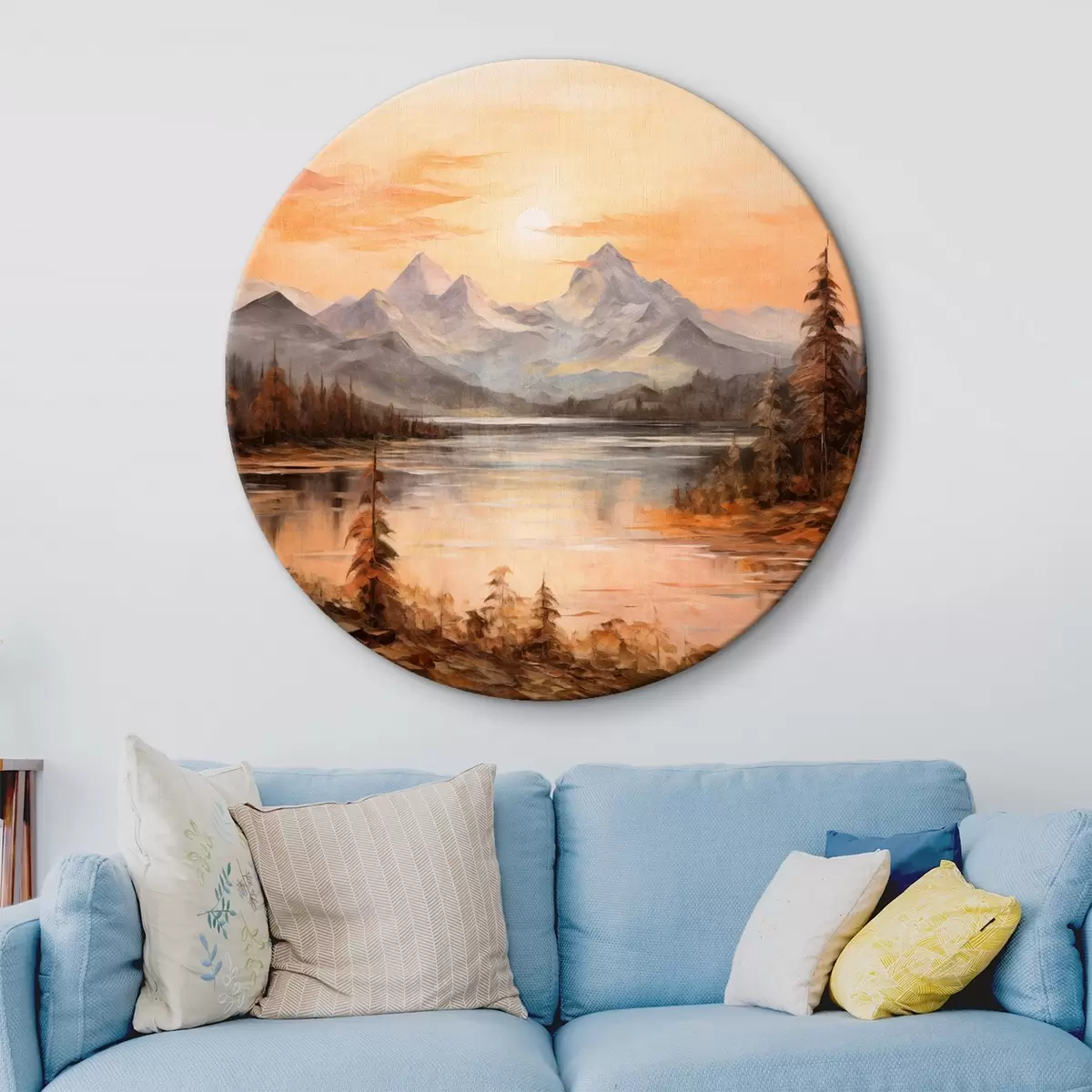 Okrągłe obrazy Krajobraz z jeziorem otoczonym drzewami i górami w tle, pomarańczowe niebo ze słońcem r44857