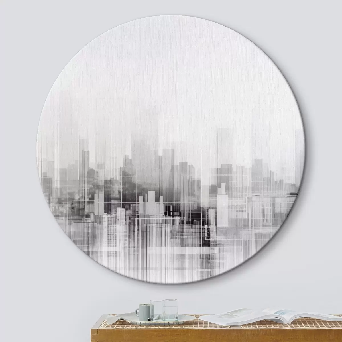 Okrągły obraz Teksturowany minimalistyczny pejzaż miejski z wysokimi budynkami i drapaczami chmur na tle białego nieba Nr r44863