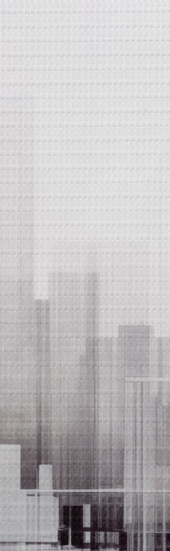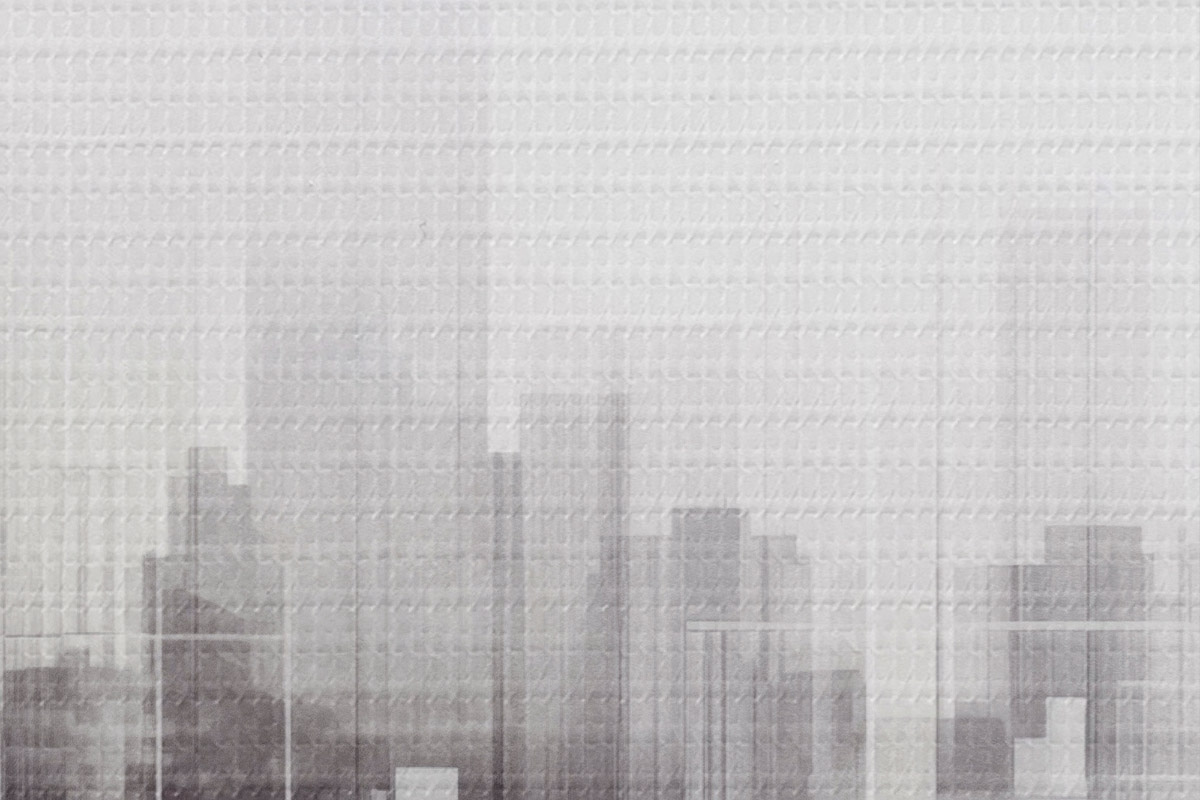 Okrągłe obrazy Teksturowany minimalistyczny pejzaż miejski z wysokimi budynkami i drapaczami chmur na tle białego nieba r44863
