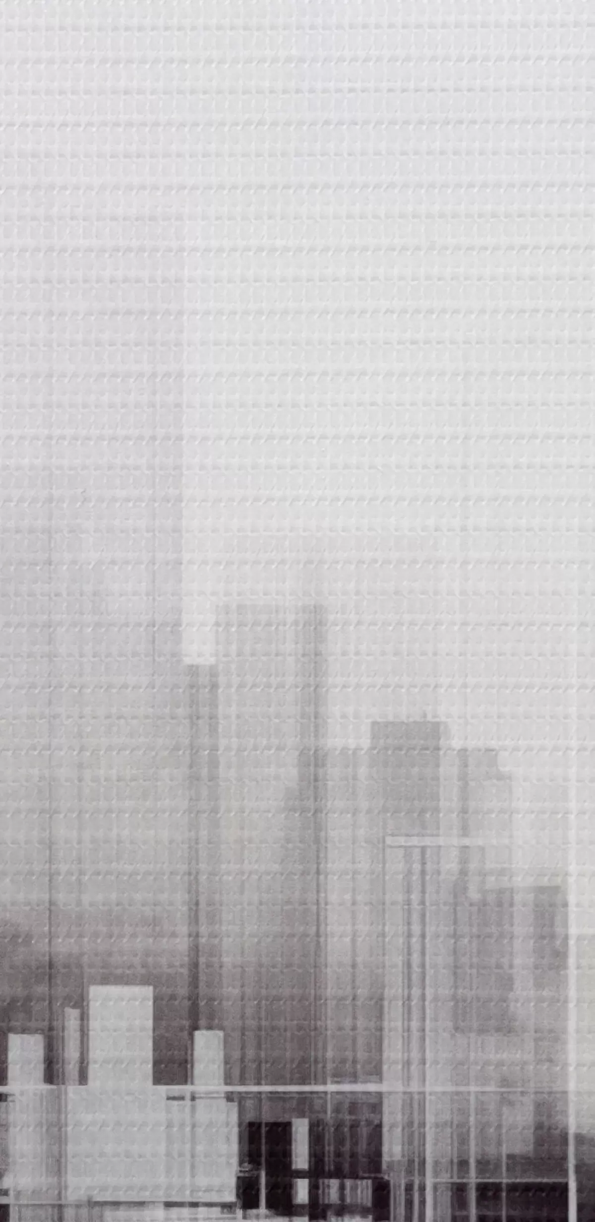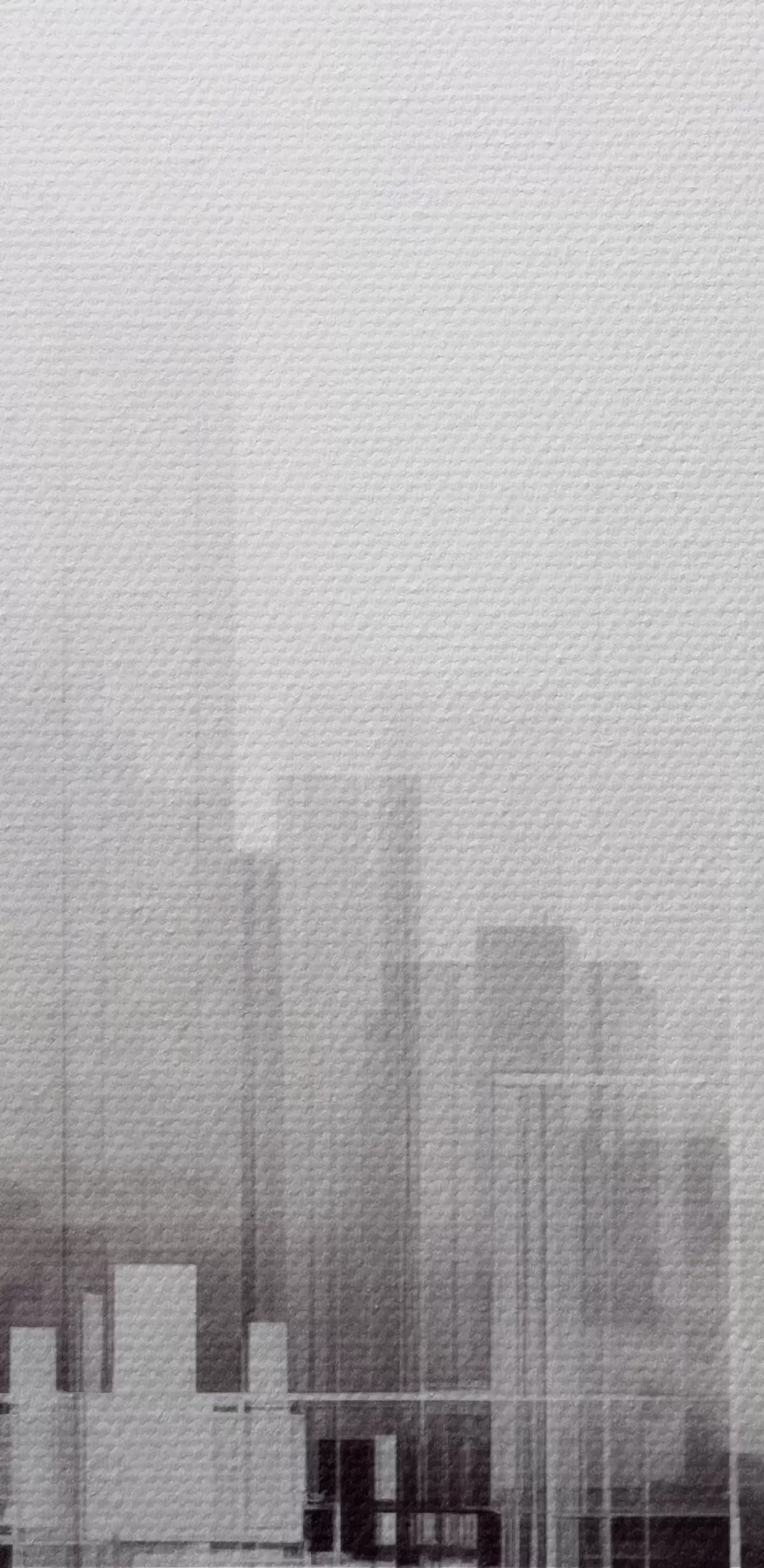Okrągłe obrazy Teksturowany minimalistyczny pejzaż miejski z wysokimi budynkami i drapaczami chmur na tle białego nieba r44863