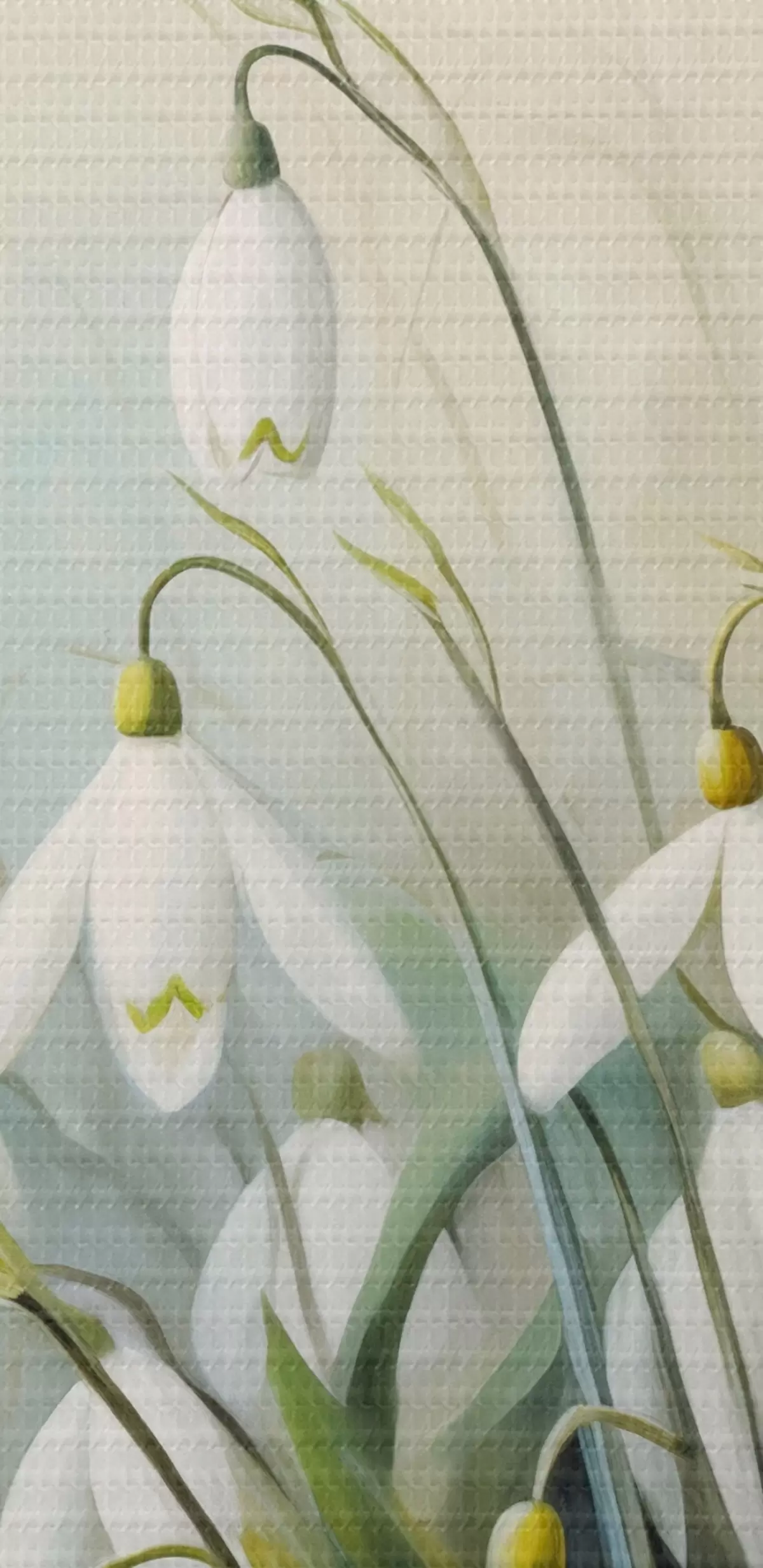 Okrągły obraz Białe kwiaty przebiśniegu z niebieskimi i zielonymi łodygami i liśćmi, miękkie pociągnięcia pędzla, rozmyte tło Nr r44864