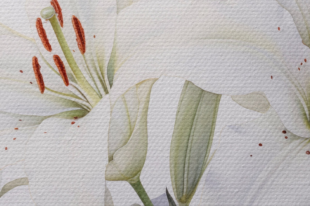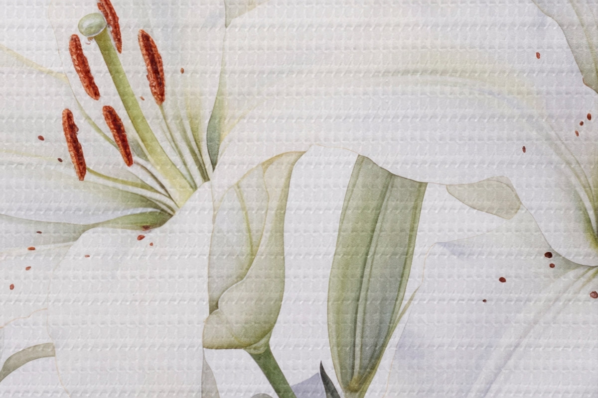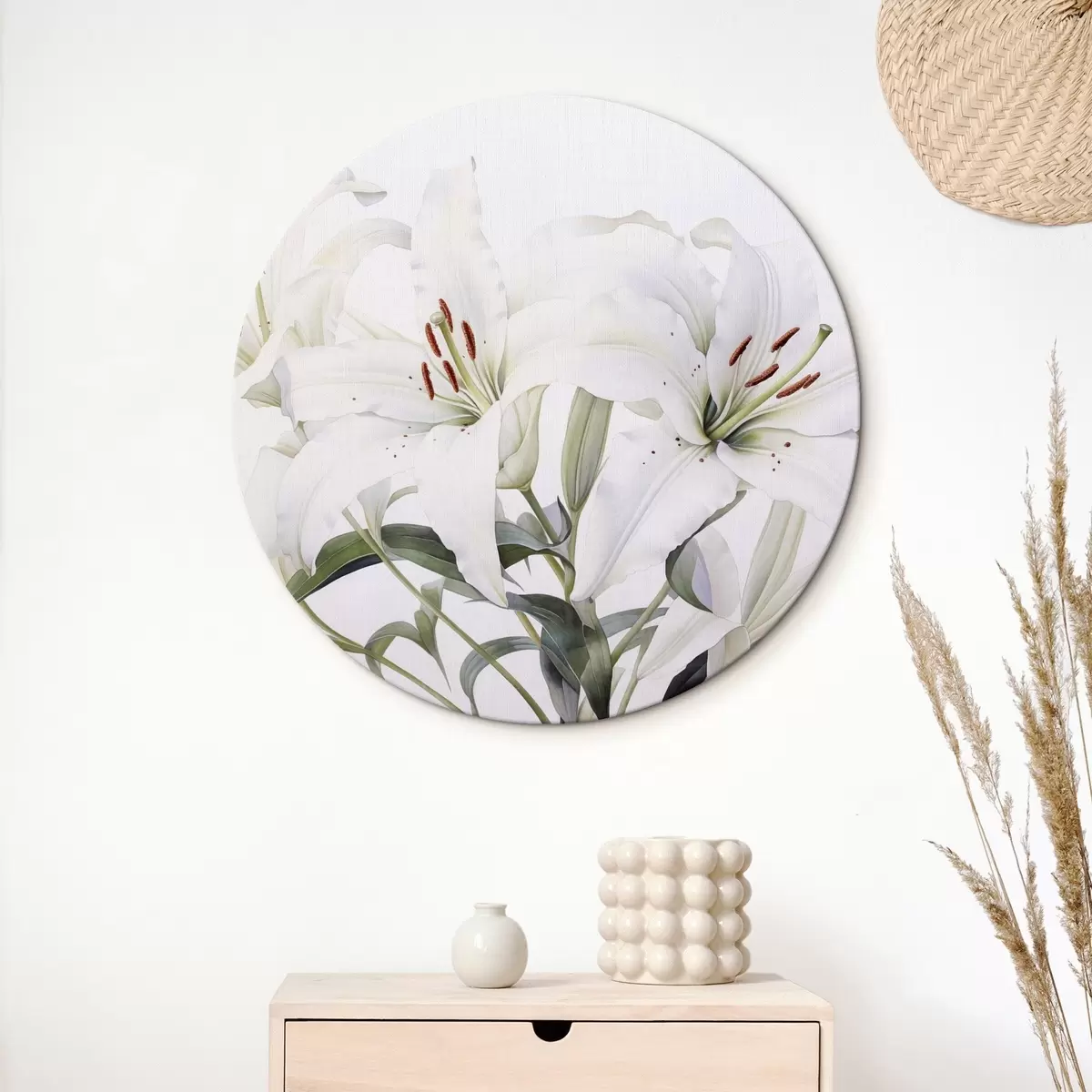 Okrągły obraz Bukiet białych lilii z zielonymi liśćmi, delikatnymi płatkami i miękkim białym tłem Nr r44868
