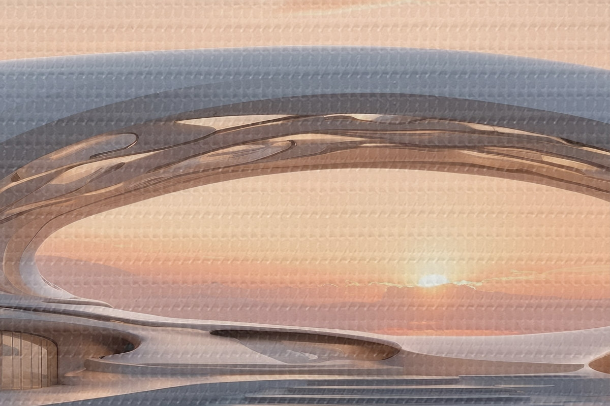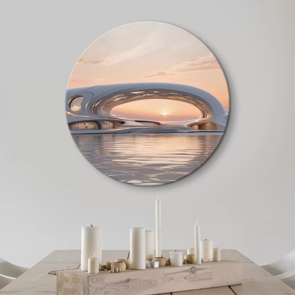 Okrągły obraz Futurystyczny budynek na wodzie na tle różowego zachodu słońca Nr r44884