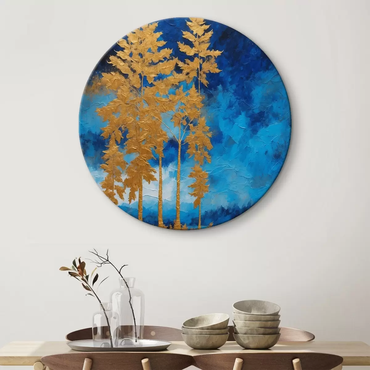 Okrągły obraz Drzewa na tle nocnego nieba w niebieskich odcieniach Nr r44888