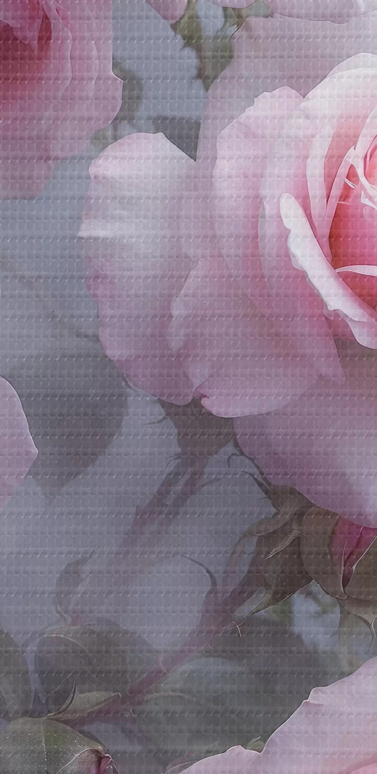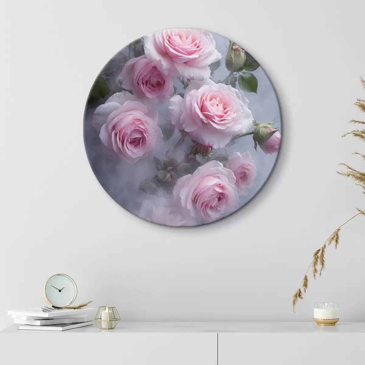 Okrągły obraz Delikatnie różowe róże we mgle z zielonymi liśćmi Nr r44892