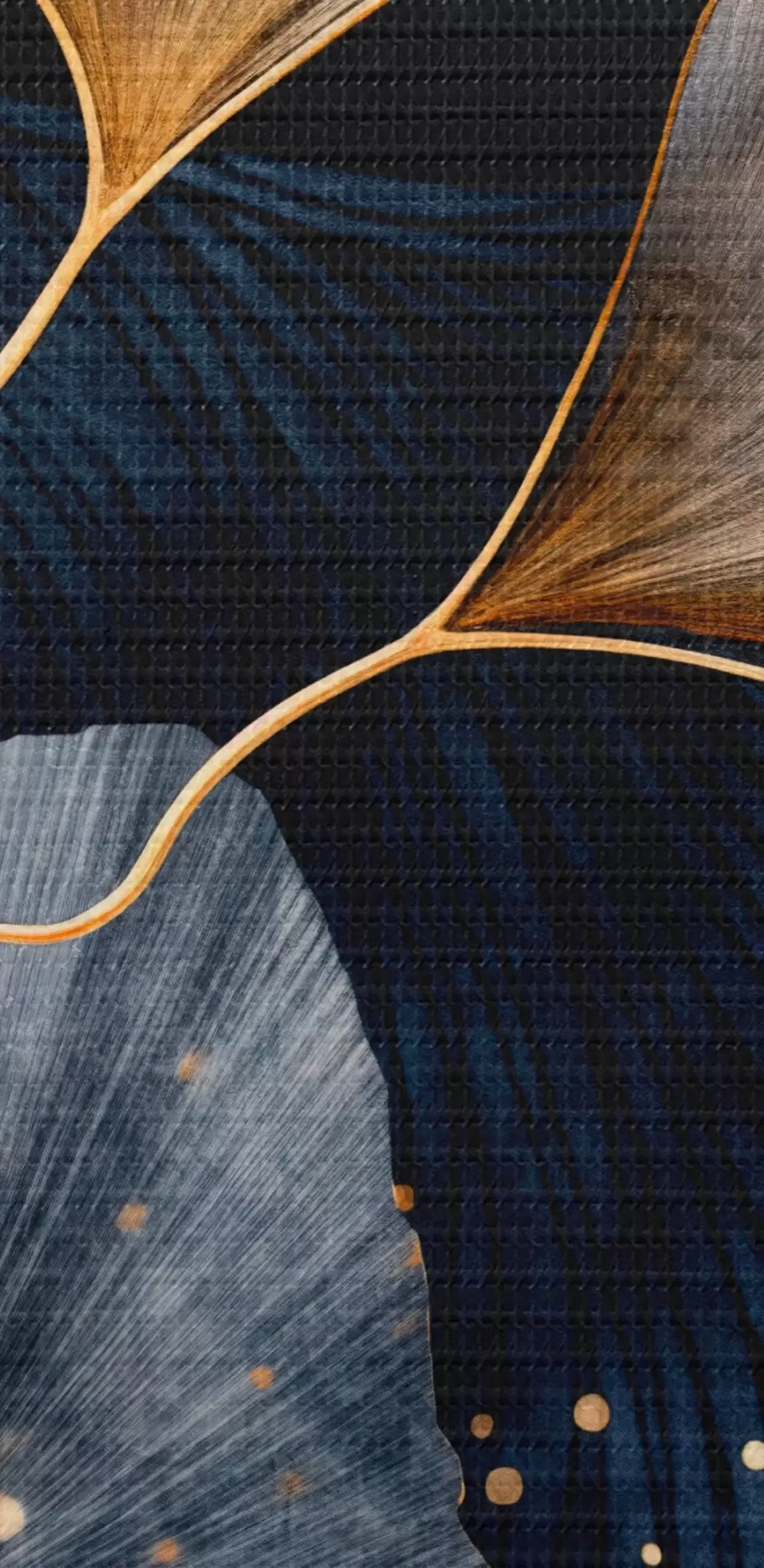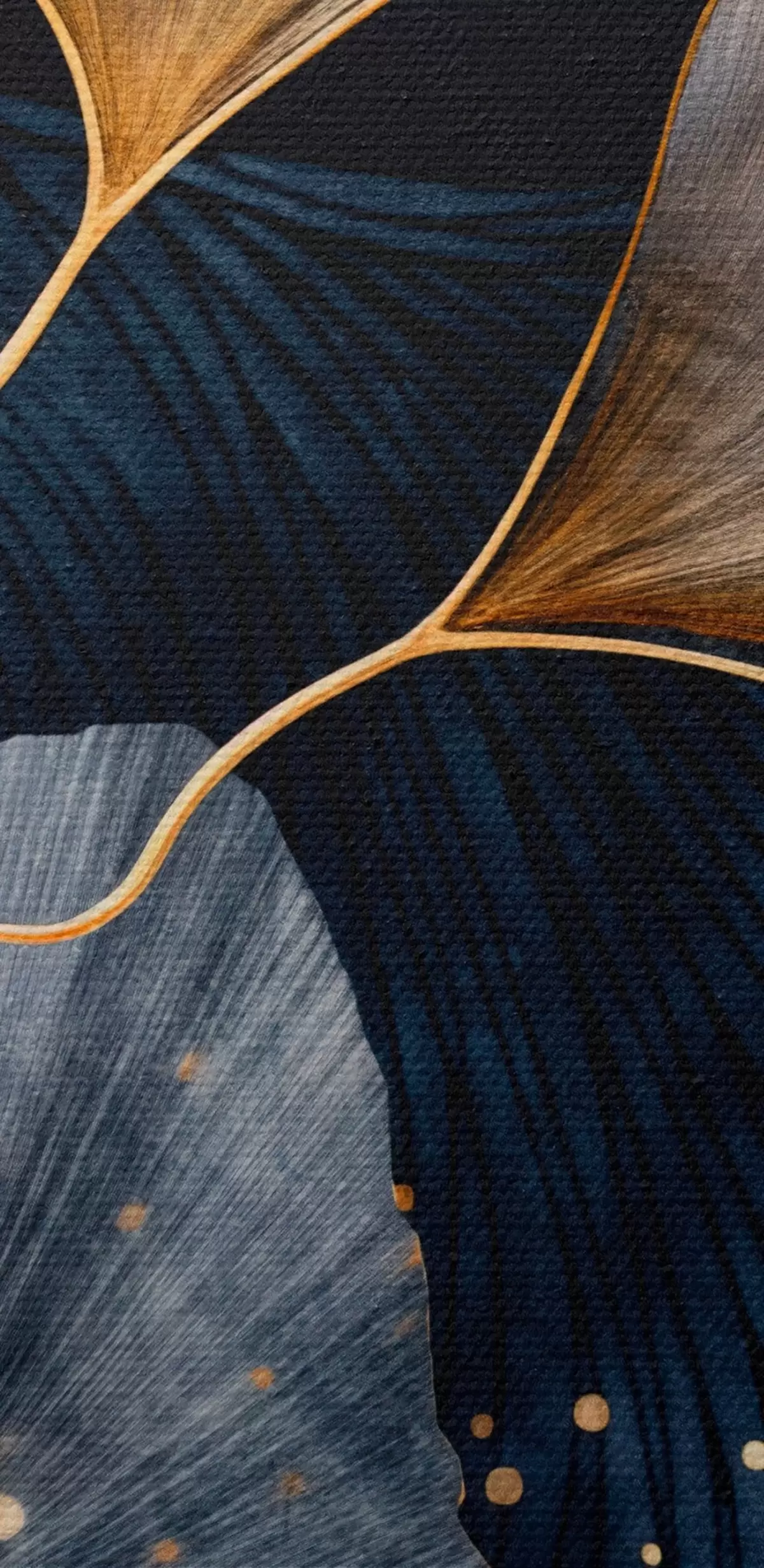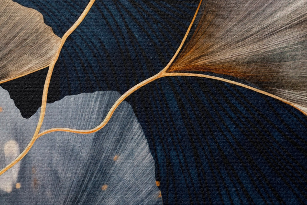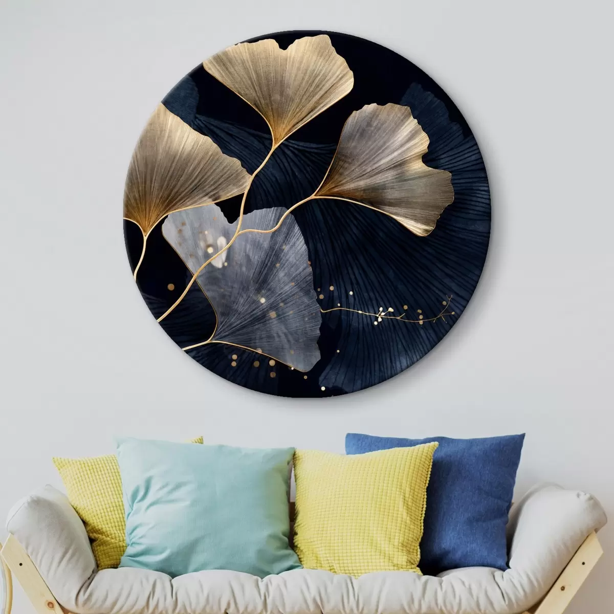Okrągły obraz Liście miłorzębu w żółtych i niebieskich odcieniach, eleganckie ciemne tło, sztuka nowoczesna, styl minimalistyczny, inspirowany naturą Nr r44921