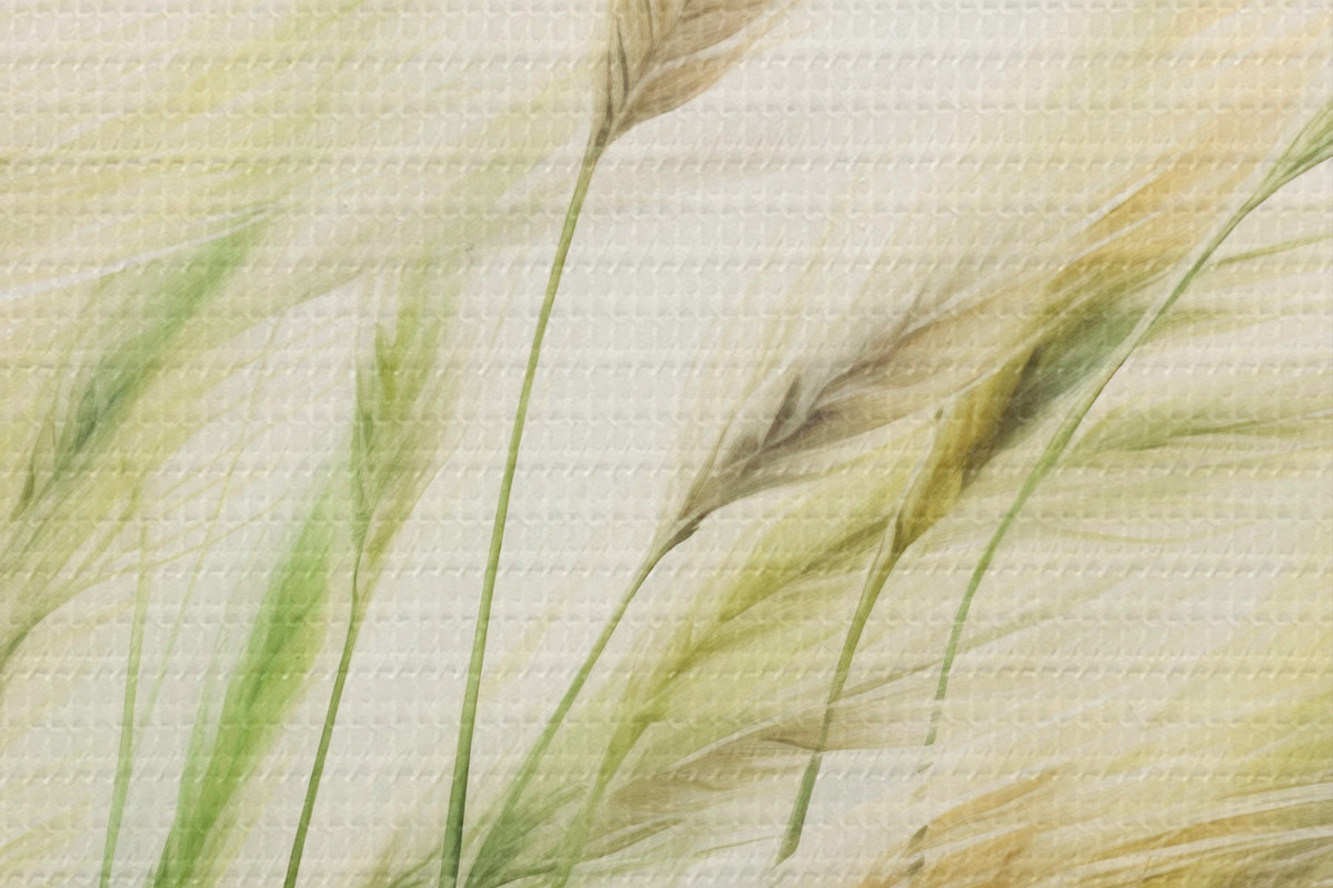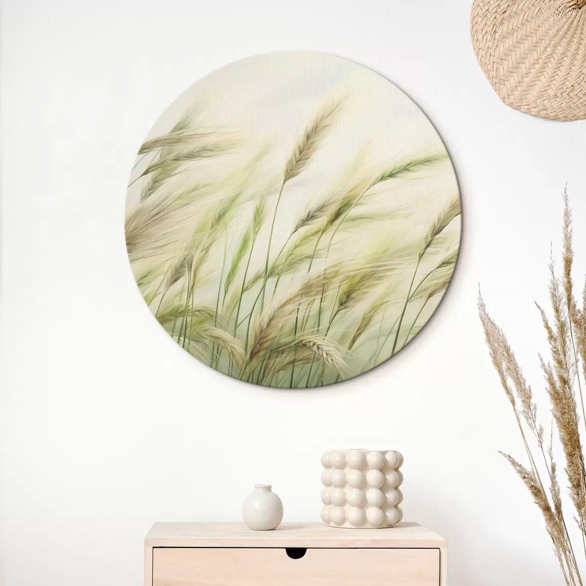 Okrągły obraz Pole pszenicy z żółtymi i zielonymi kłosami zboża, miękkie pociągnięcia pędzla i jasna paleta kolorów, naturalna atmosfera Nr r44923