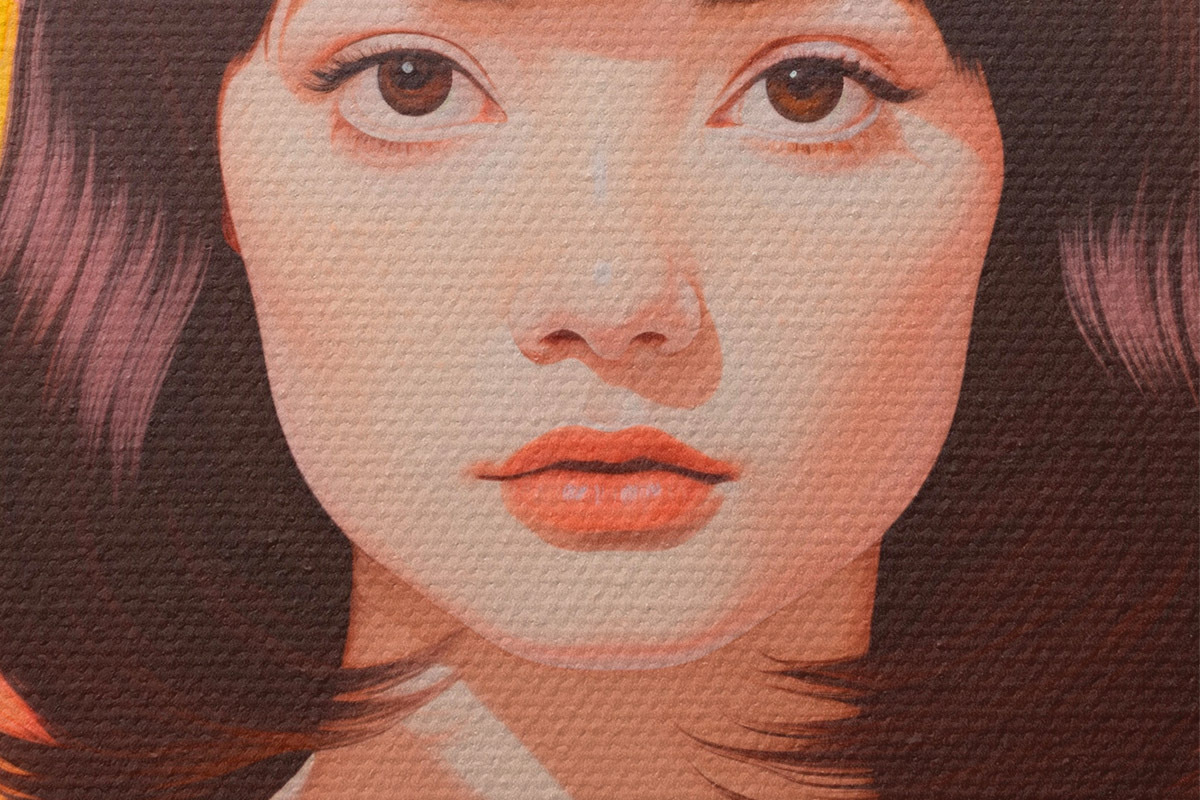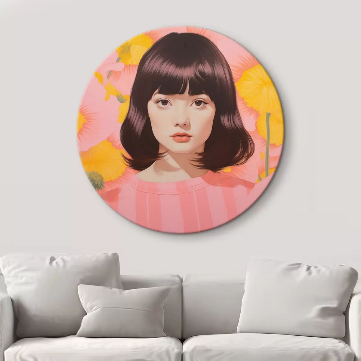 Okrągły obraz Dekoracyjny minimalistyczny portret azjatyckiej dziewczyny w polu żółtych i różowych kwiatów Nr r44924