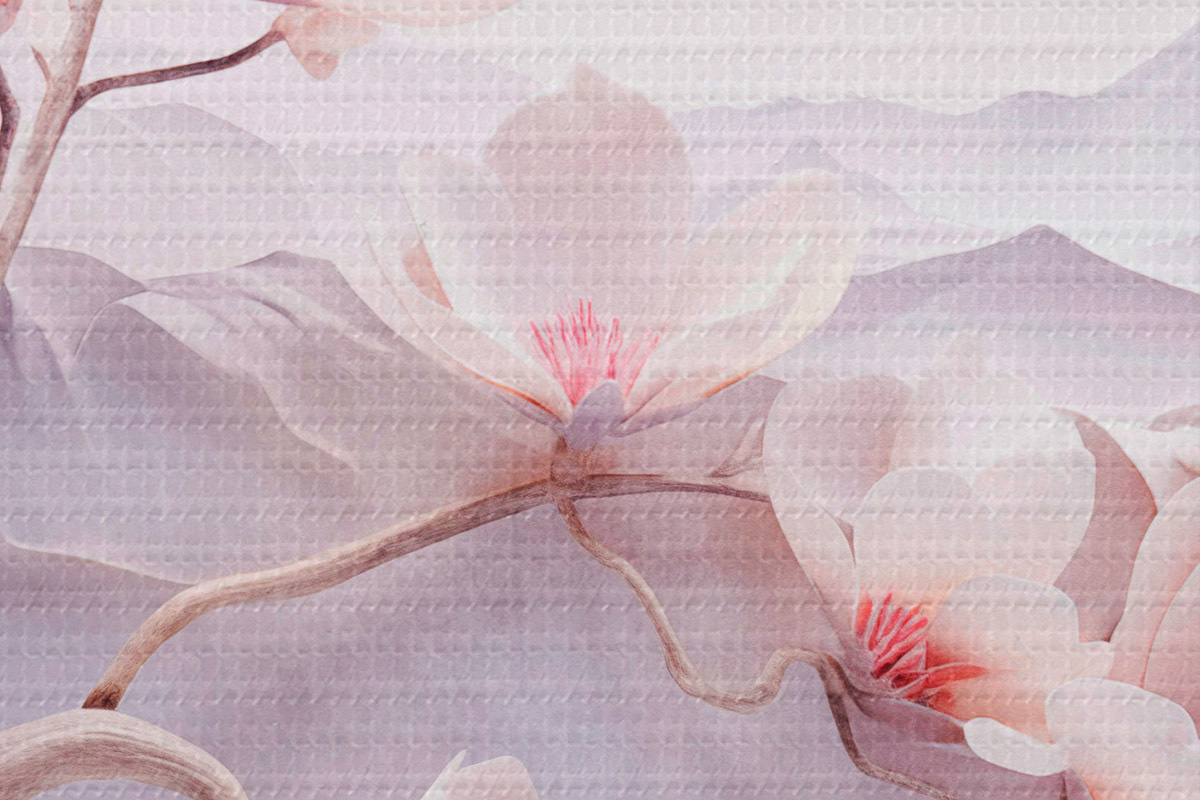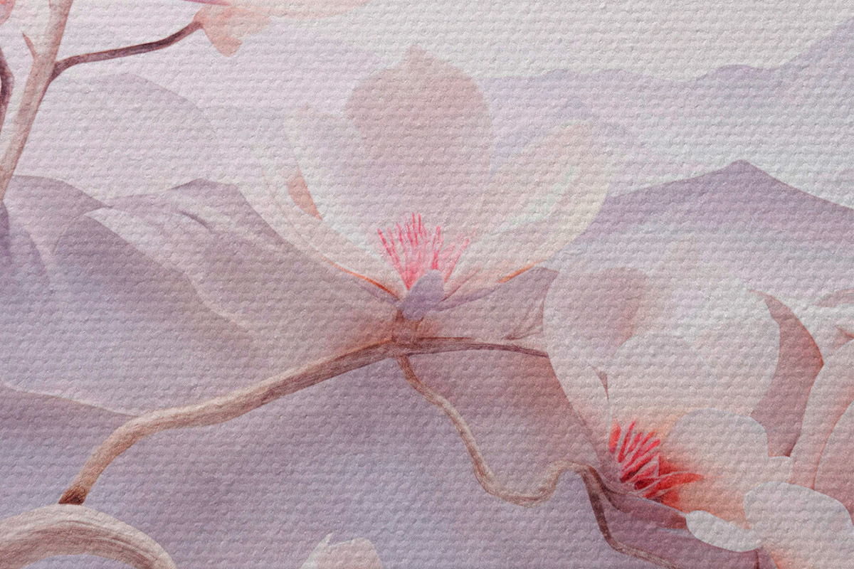 Okrągłe obrazy Kwitnąca gałąź z różowymi kwiatami, góry w tle, delikatne pastelowe kolory, japońska sztuka teksturowana r44930
