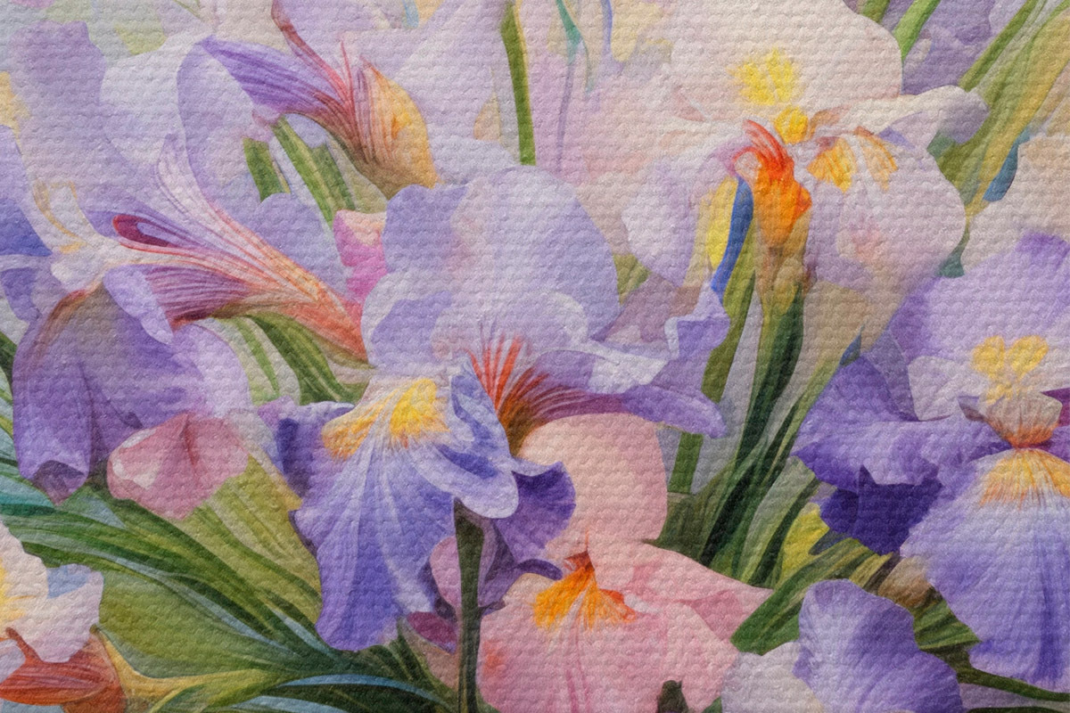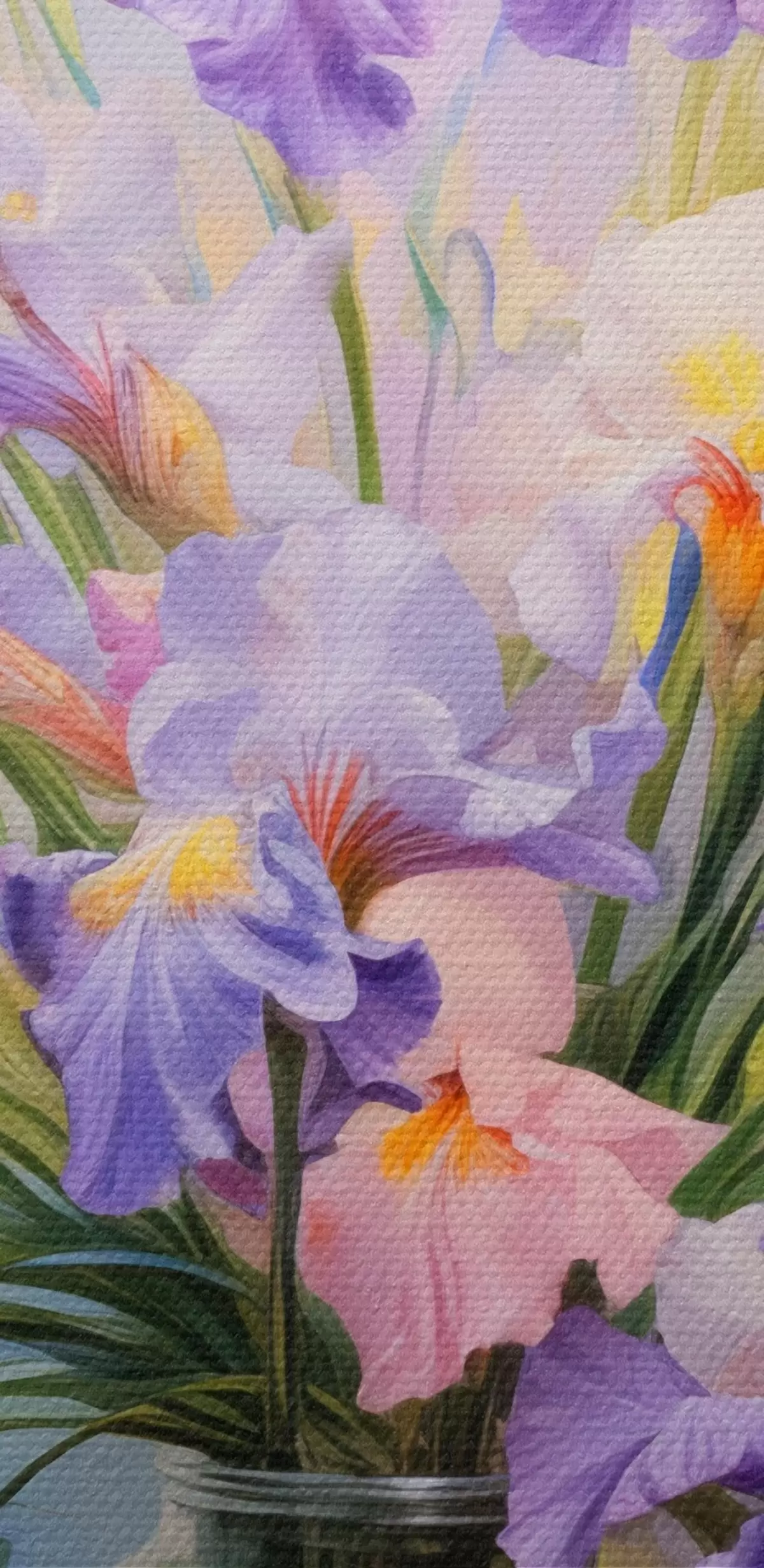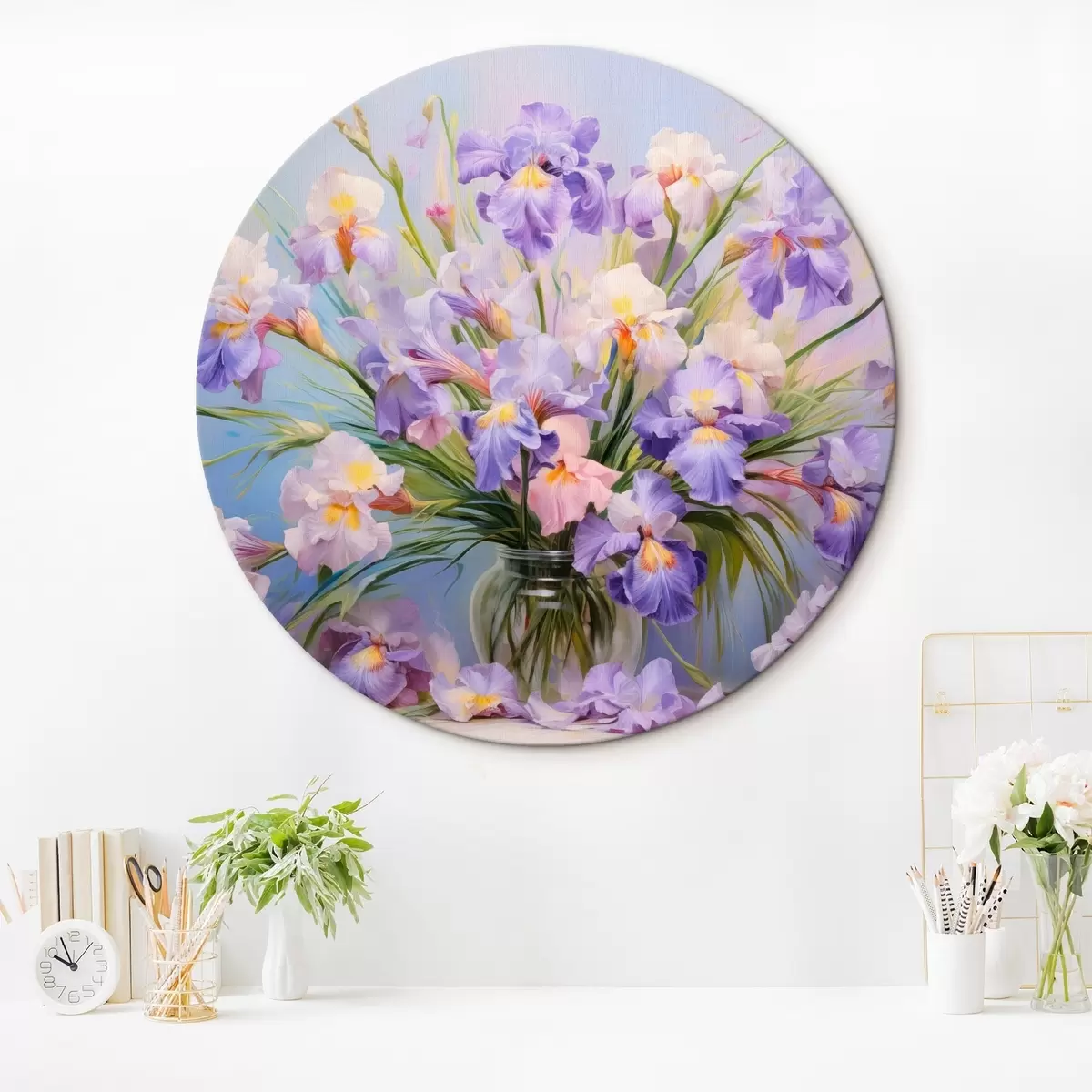 Okrągły obraz Wazon z wieloma pastelowymi irysami, kilka płatków rozsypanych na stole, miękkie pastelowe tło z niebieskimi i różowymi odcieniami Nr r44933