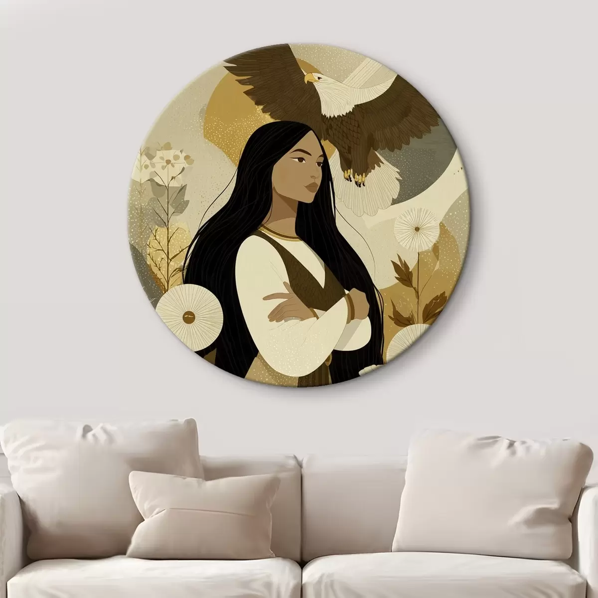 Okrągłe obrazy Kobieta z latającym orłem, styl plemienny, beżowe kolory r44977