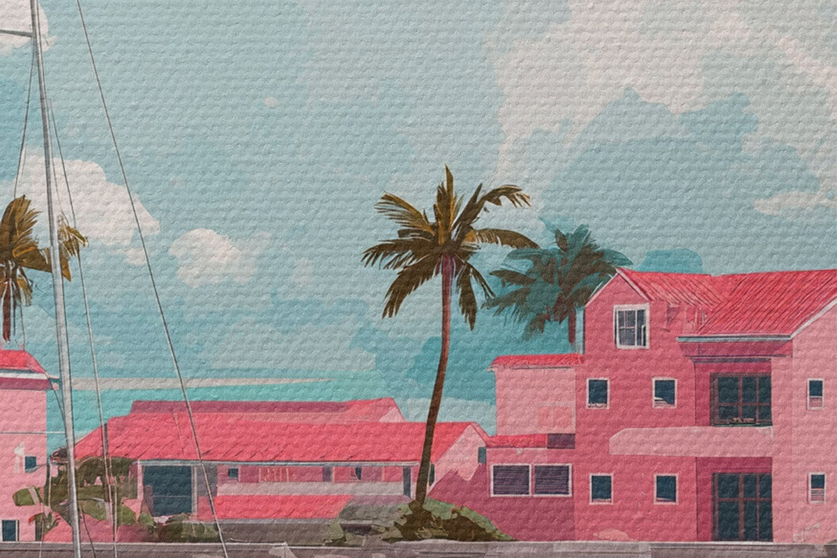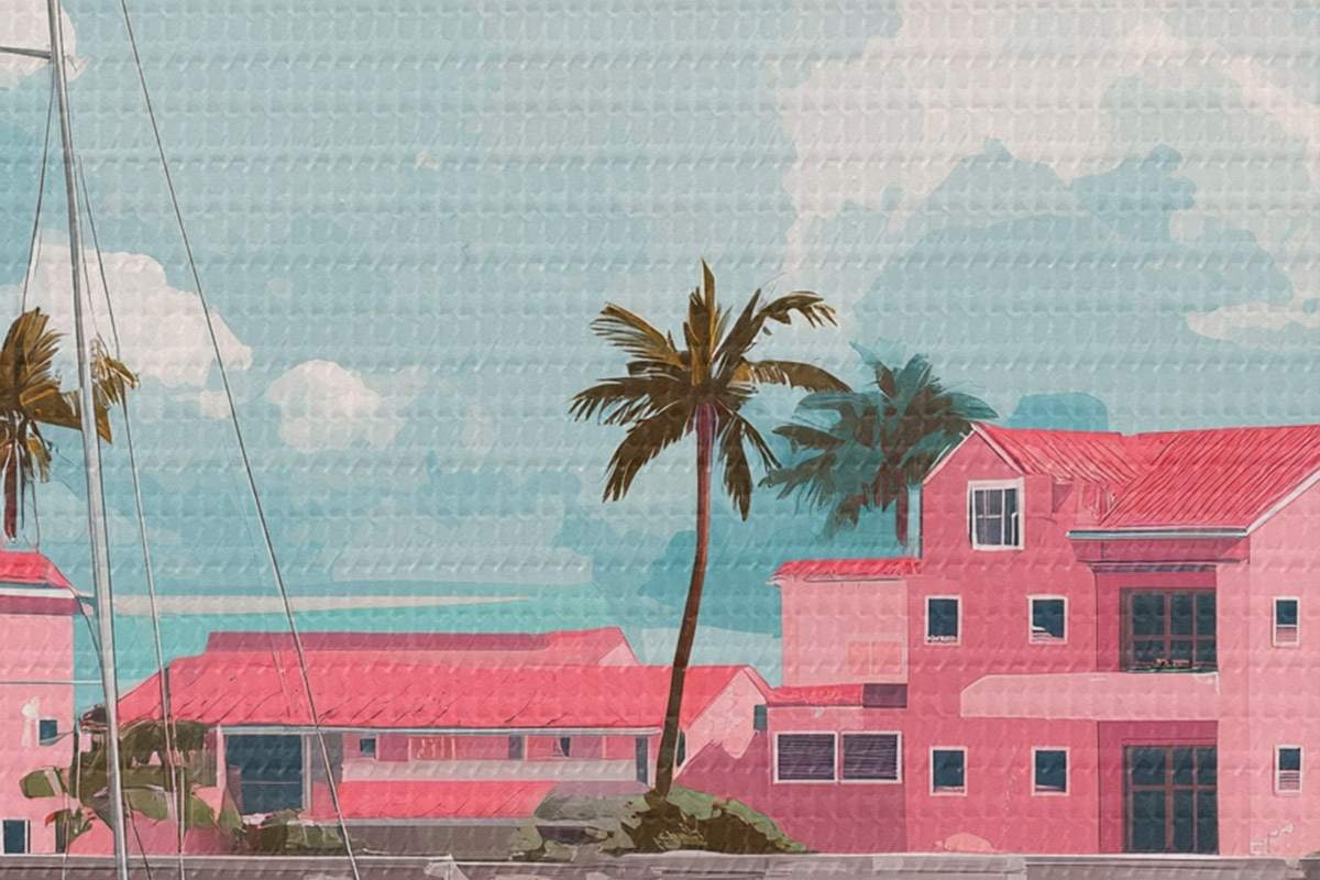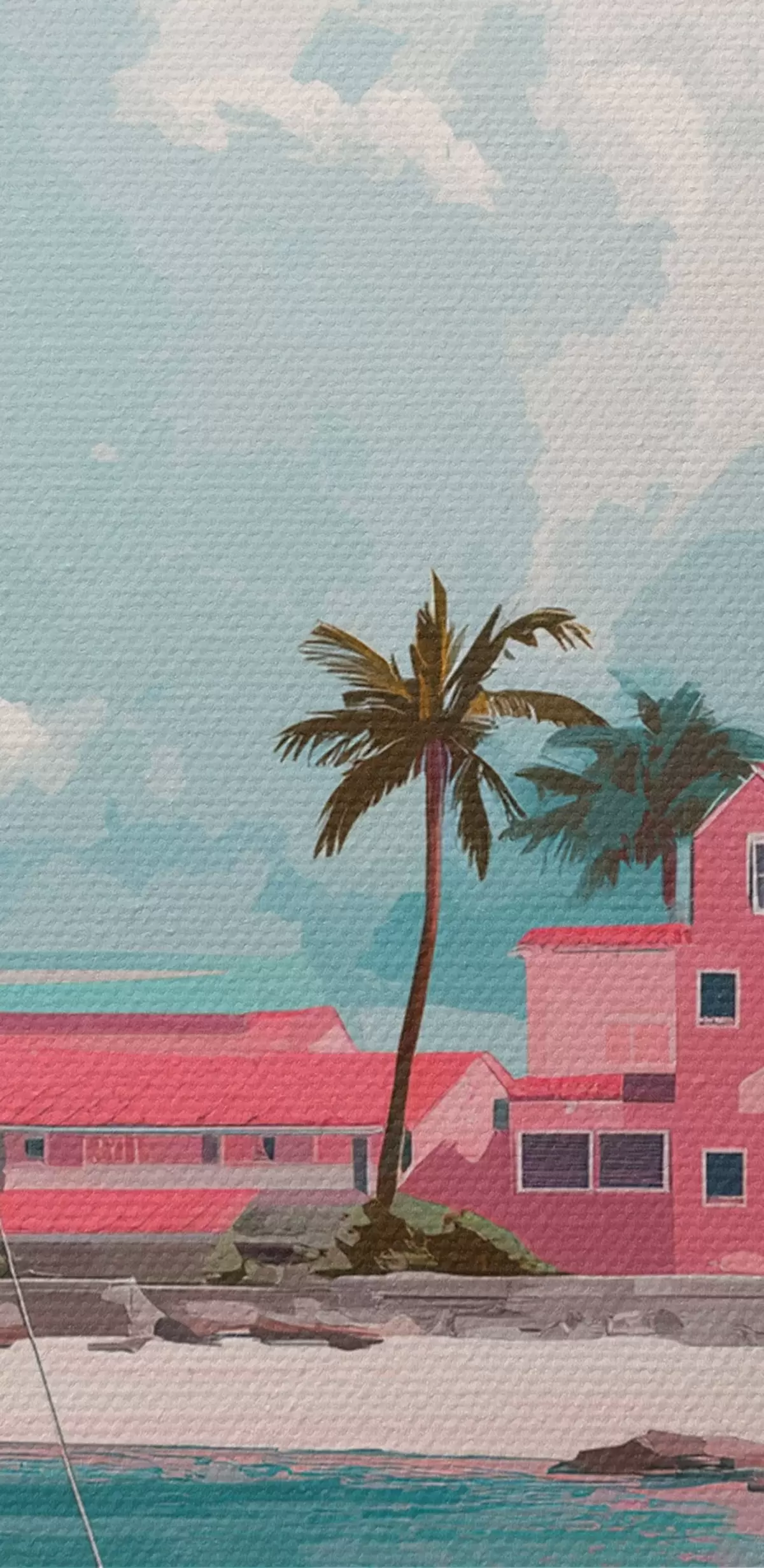 Okrągłe obrazy Różowa plaża z jasnym słońcem, żaglówką i domami r44986