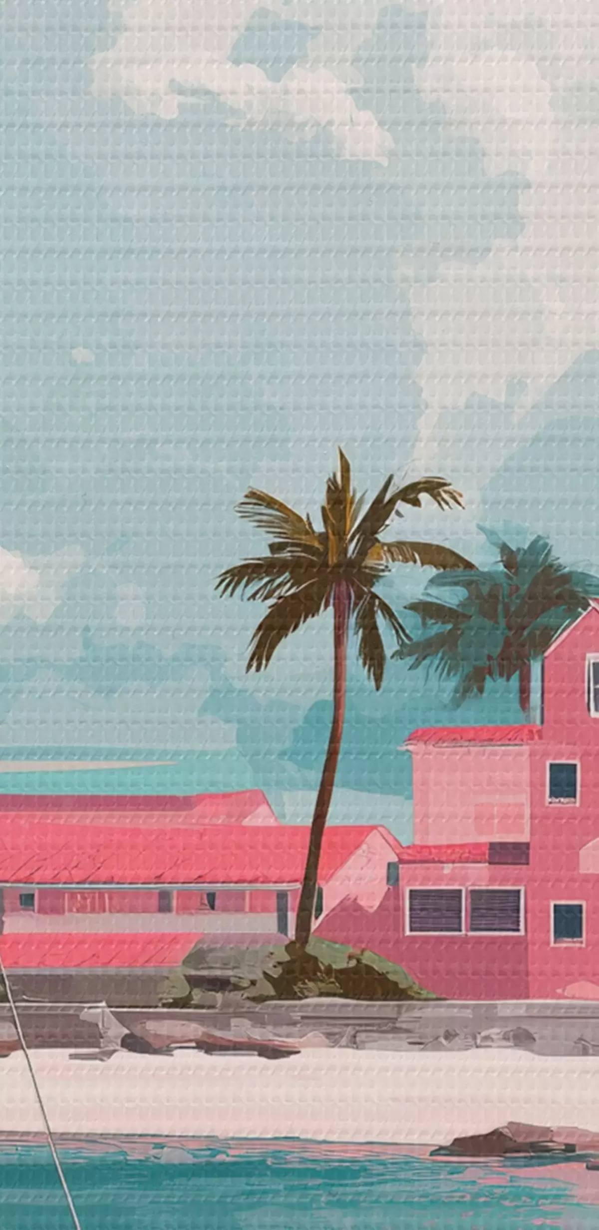 Okrągły obraz Różowa plaża z jasnym słońcem, żaglówką i domami Nr r44986