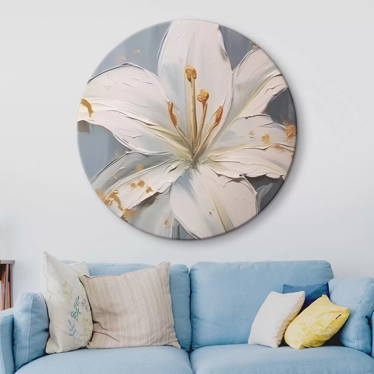 Okrągły obraz Biała lilia z żółtymi akcentami na niebieskim tle Nr r45078