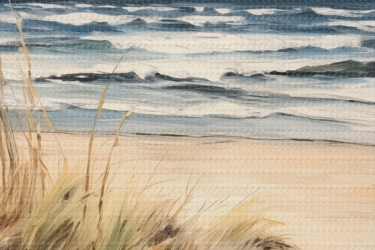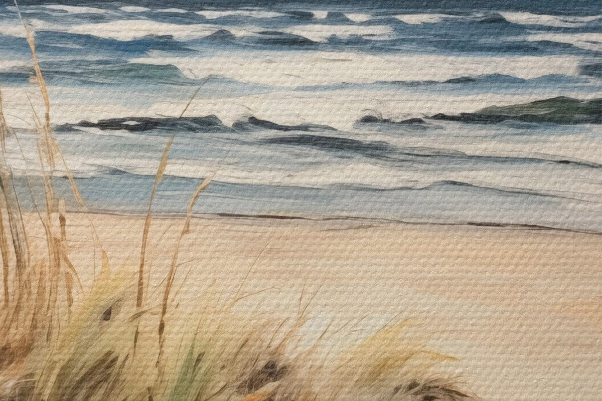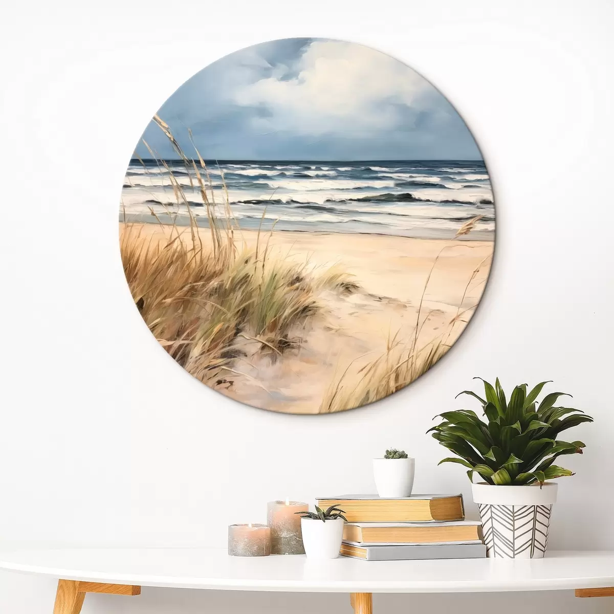 Okrągłe obrazy Piaszczysta plaża z wysoką trawą na pierwszym planie, ocean z falami i zachmurzone niebo w tle r45173