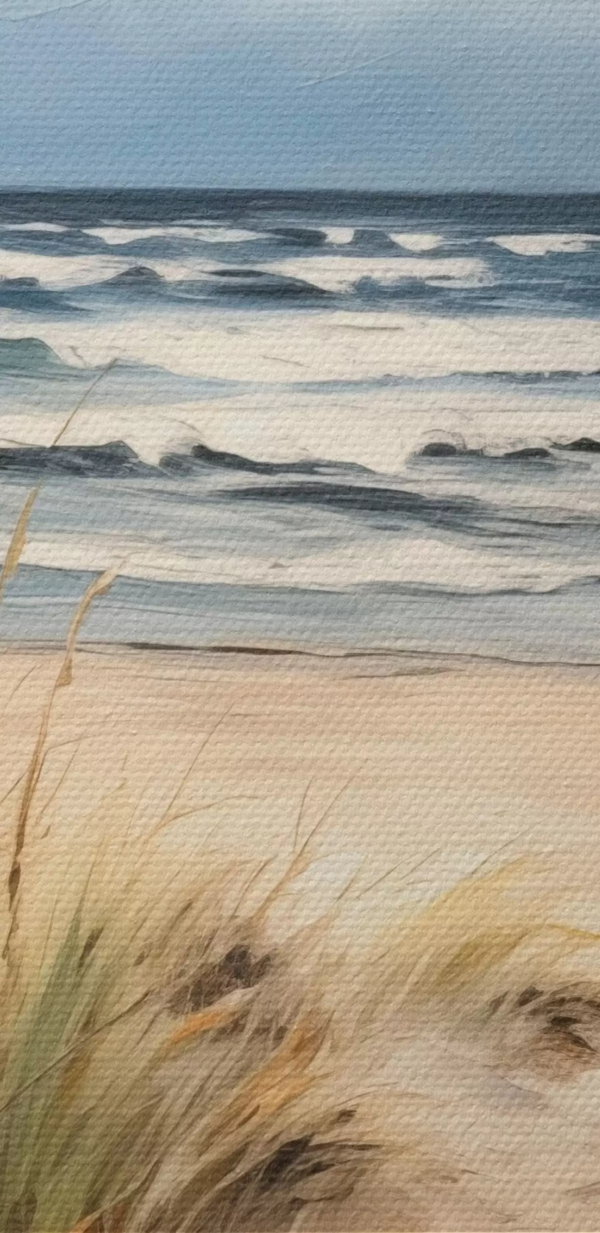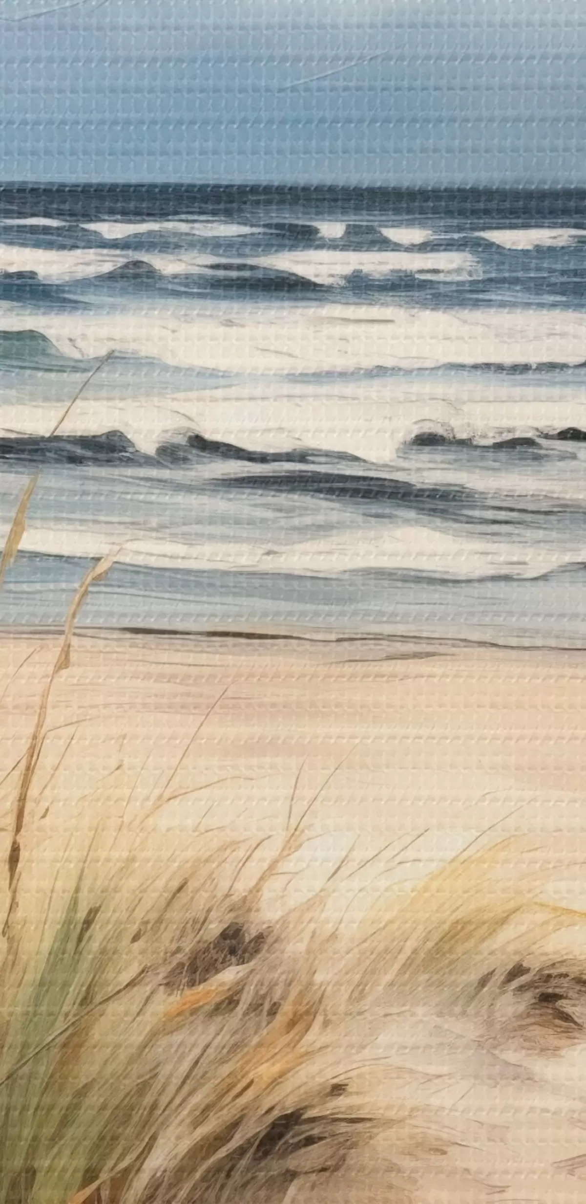 Okrągły obraz Piaszczysta plaża z wysoką trawą na pierwszym planie, ocean z falami i zachmurzone niebo w tle Nr r45173