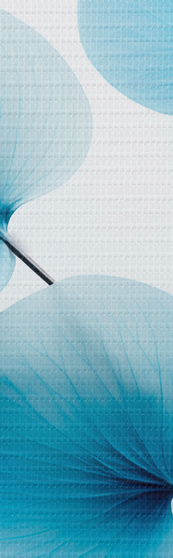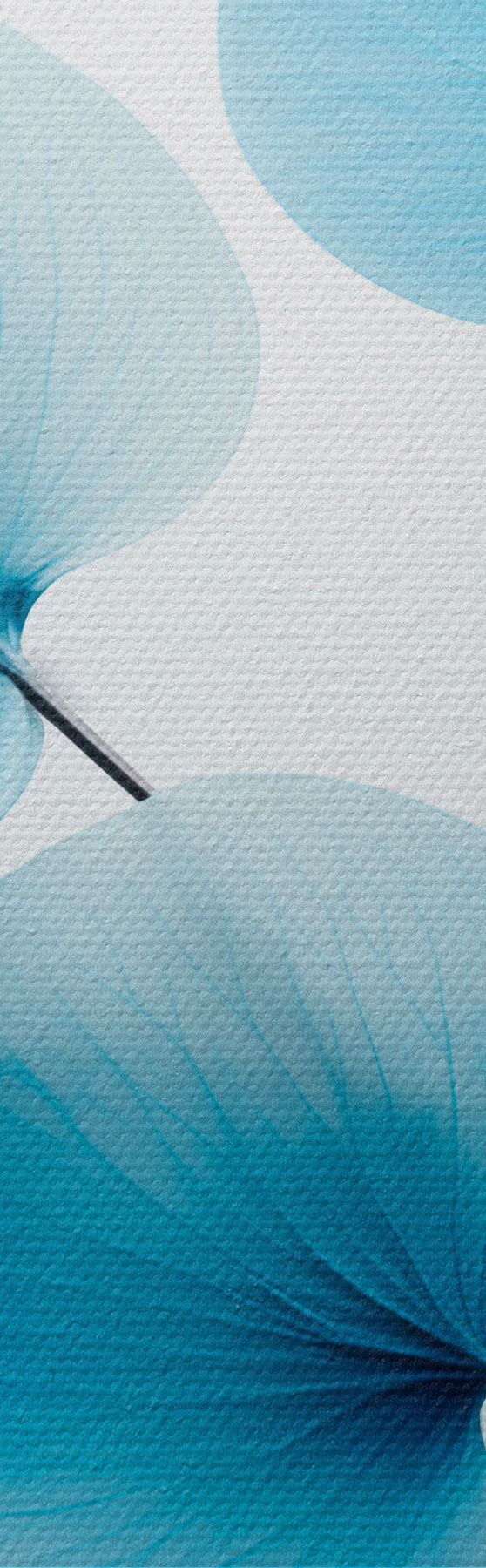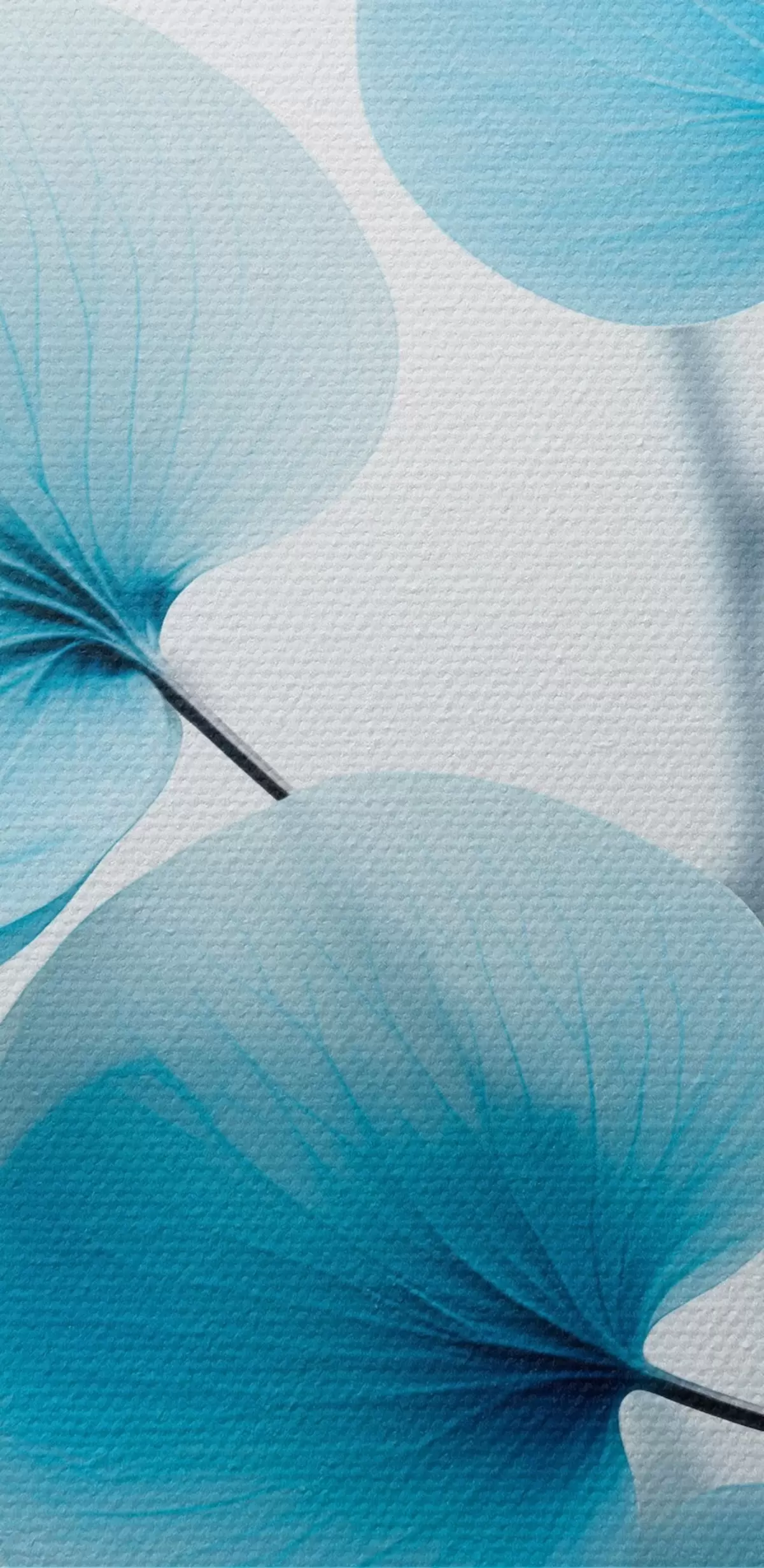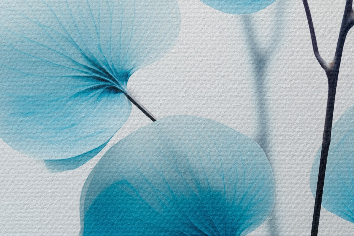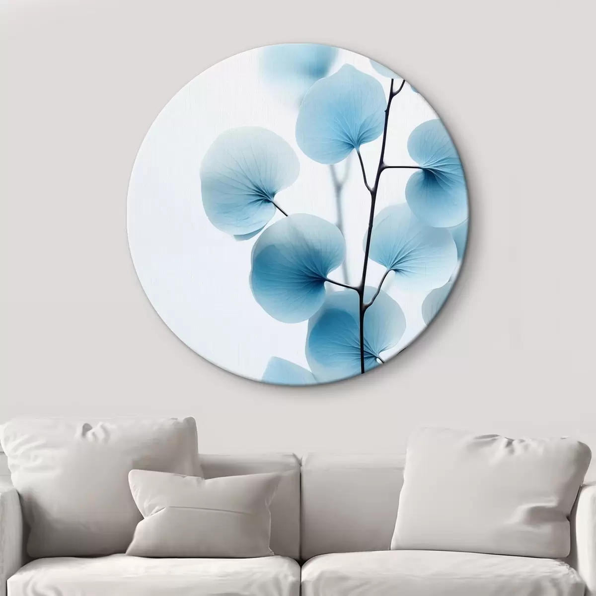 Okrągły obraz Gałązka z półprzezroczystymi niebieskimi liśćmi, widoczne delikatne żyłki, lekka i spokojna kompozycja, minimalistyczna estetyka Nr r45176