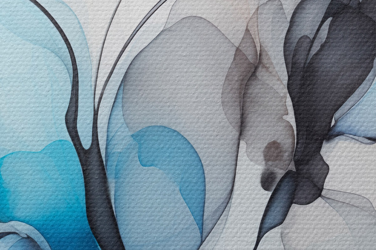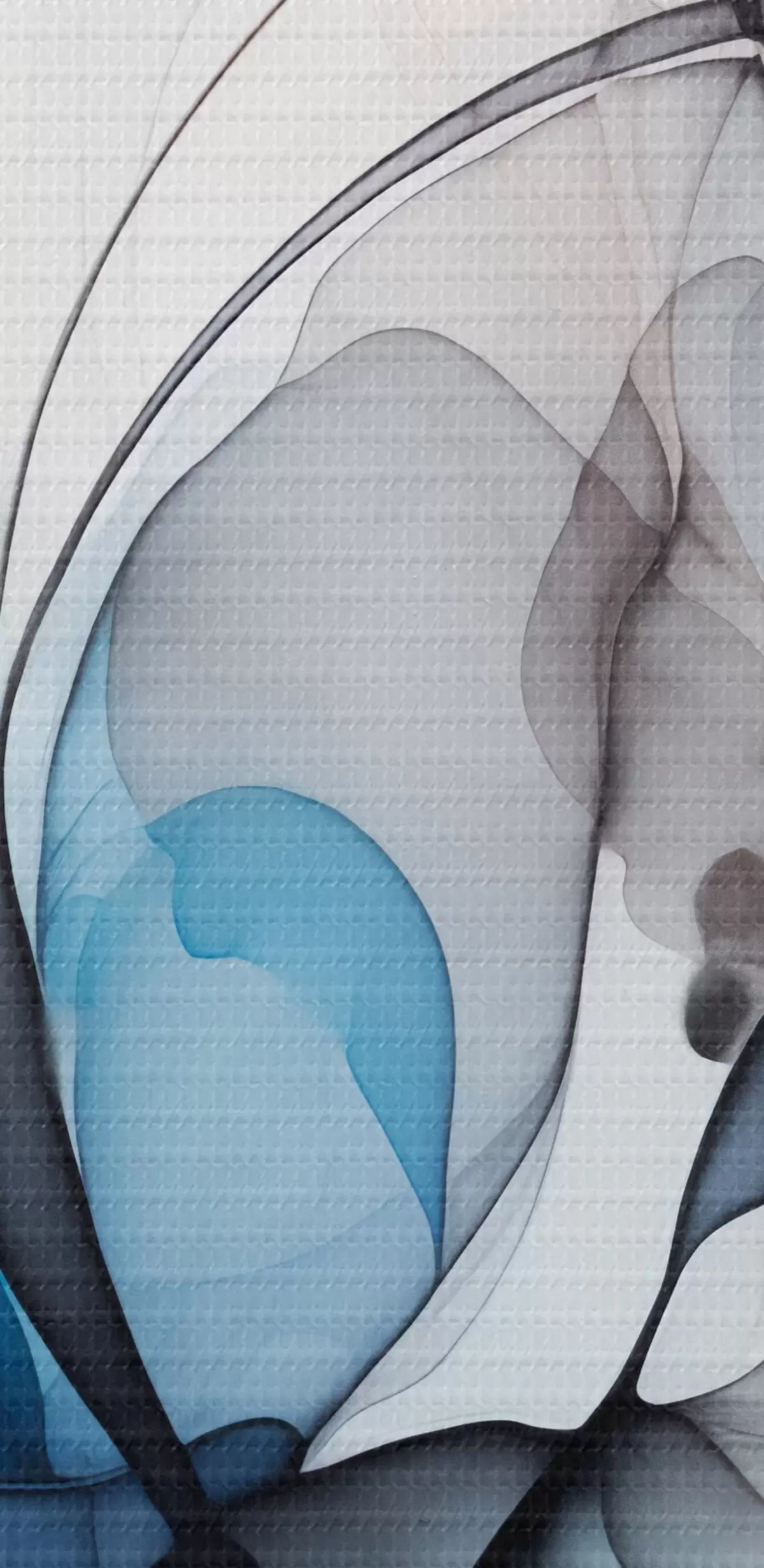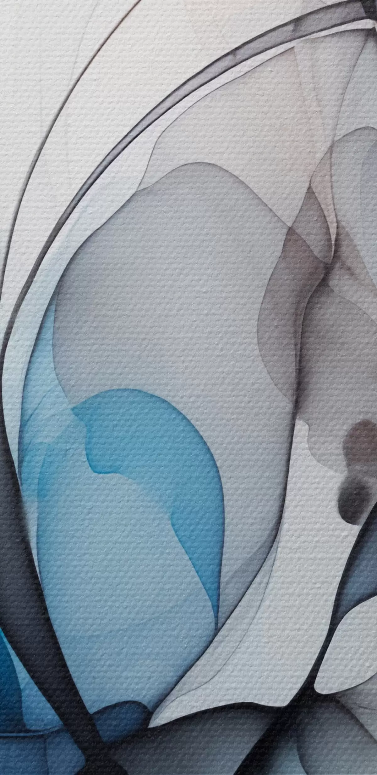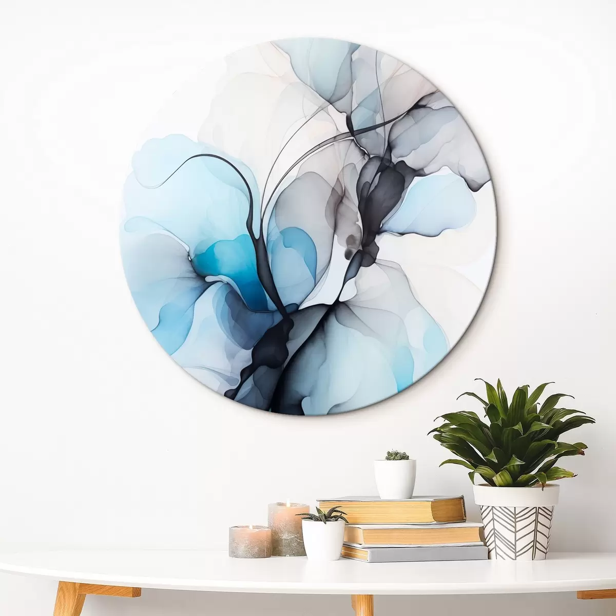 Okrągły obraz Abstrakcyjna kompozycja z płynnymi liniami i półprzezroczystymi płatkami w odcieniach błękitu, bieli i beżu, imitacja tuszu alkoholowego Nr r45177