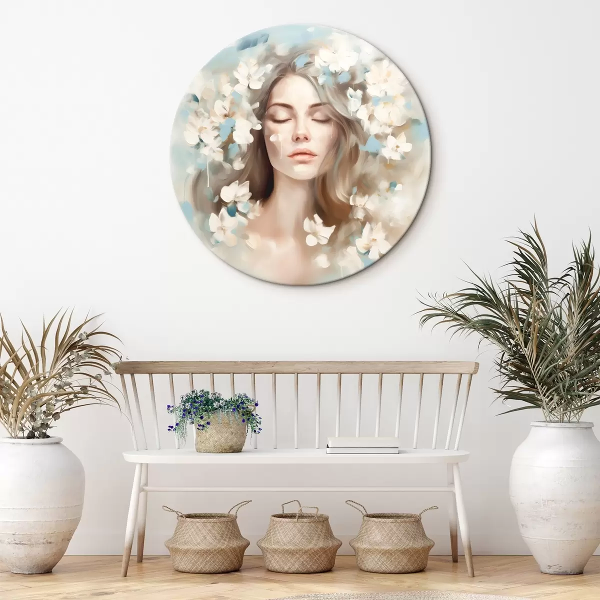 Okrągły obraz Abstrakcyjny portret kobiety z kwiatami w formie pociągnięć pędzla Nr r45450