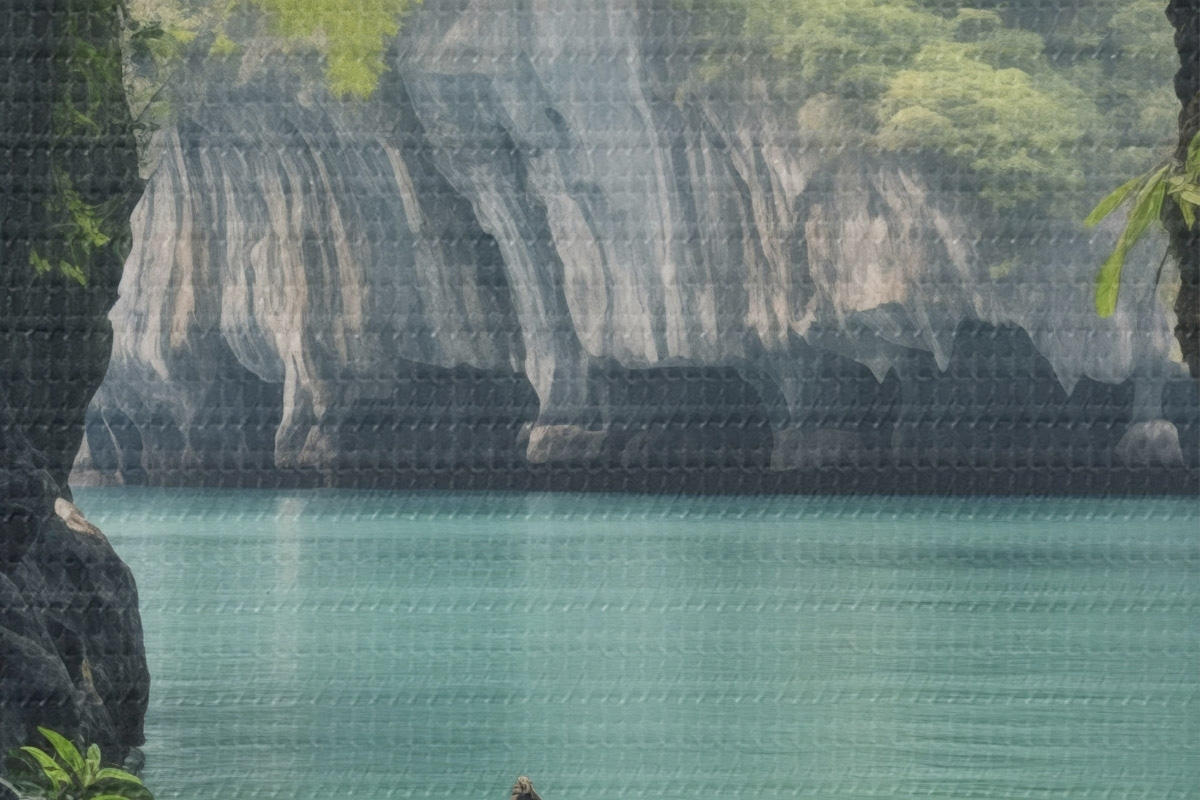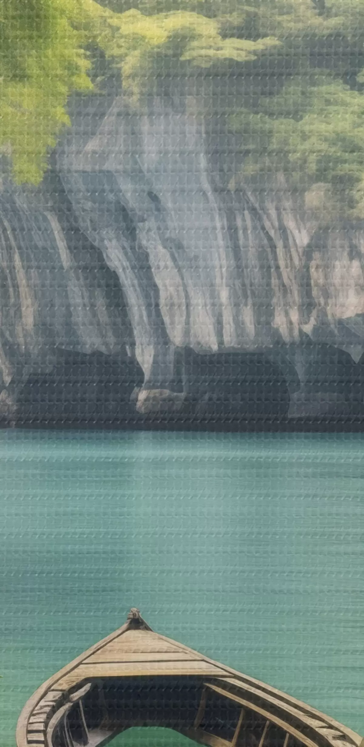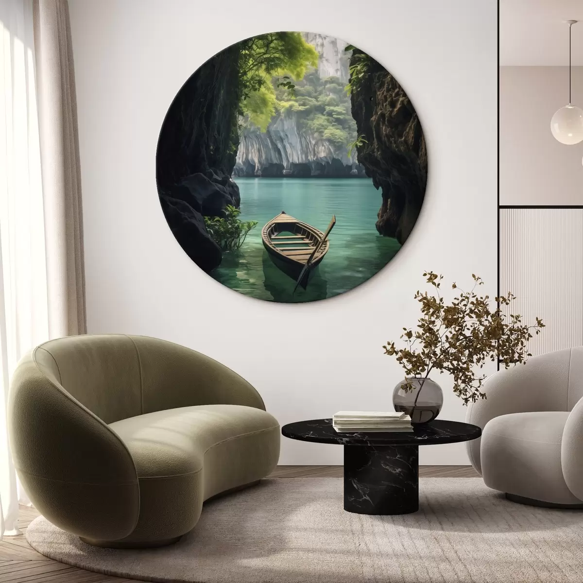 Okrągły obraz Łódź na turkusowej wodzie wśród skał Nr r45507