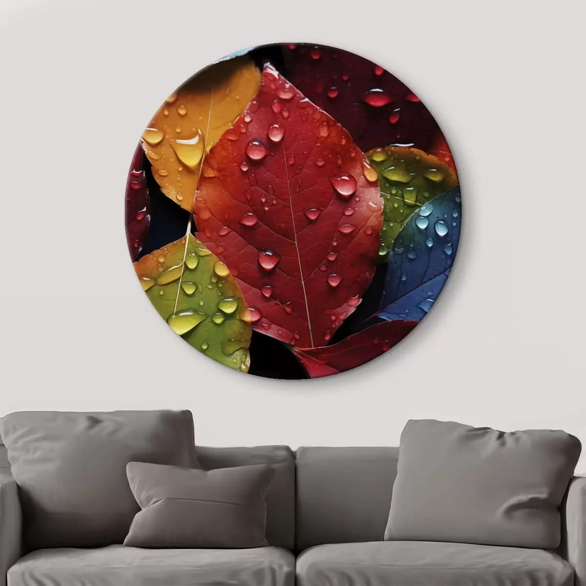 Okrągły obraz Kolorowe liście z kroplami wody Nr r45516