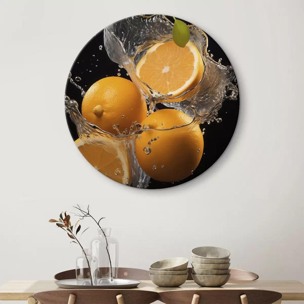Okrągły obraz Soczyste pomarańcze w bryzgach wody Nr r45526