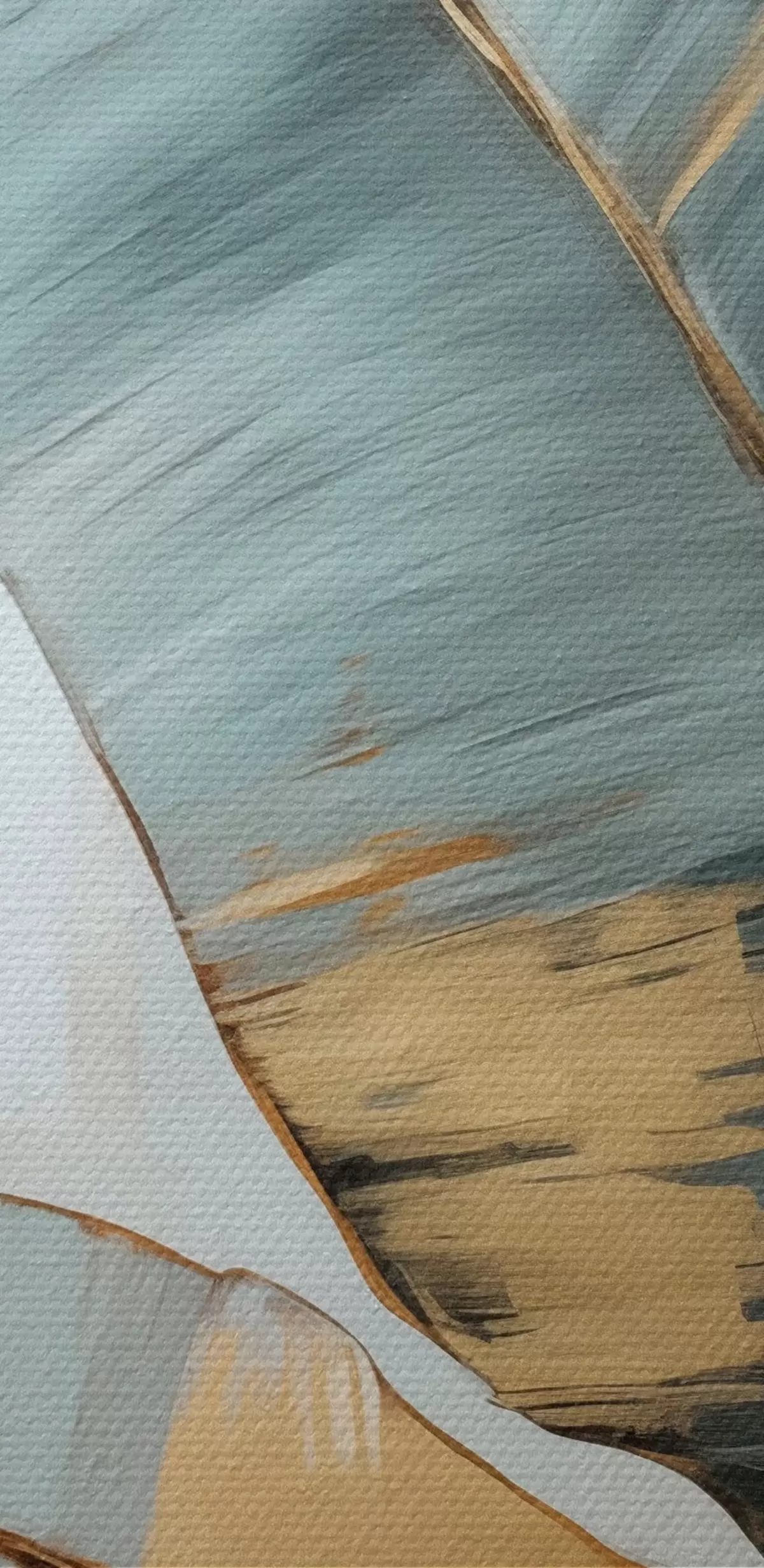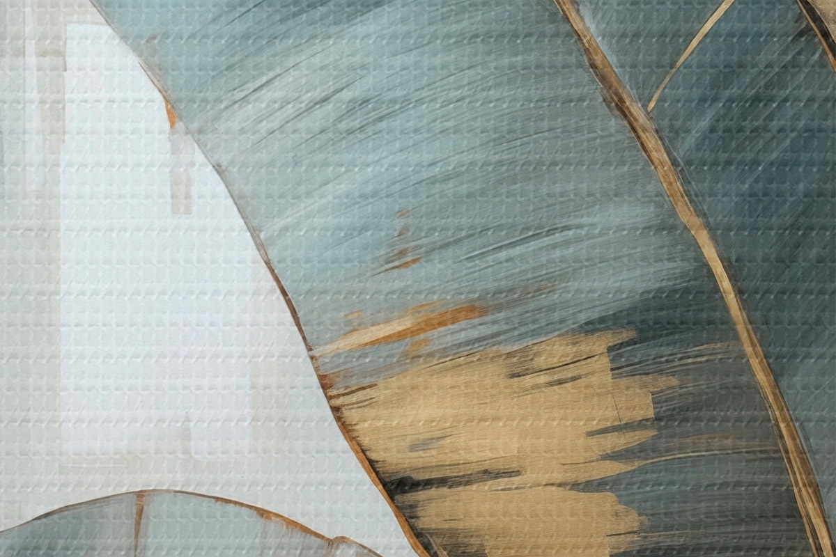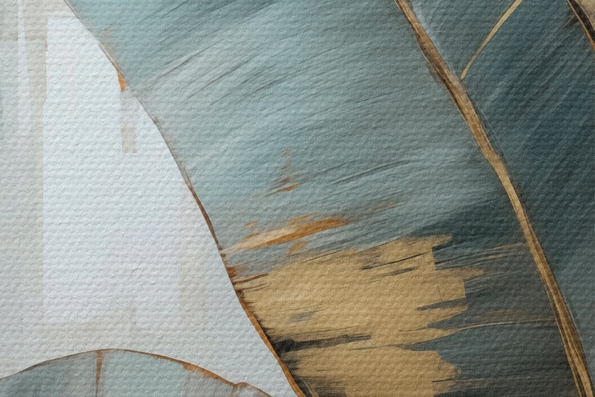 Okrągły obraz Zestaw stonowanych niebieskich, szarych i żółtych liści bananowca z widocznymi pociągnięciami pędzla na białym abstrakcyjnym tle Nr r45551