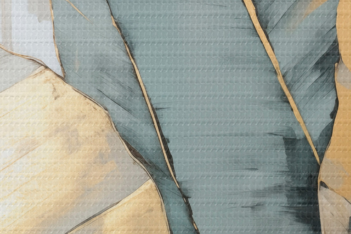 Okrągły obraz Wyciszone niebieskie, szare i żółte liście bananowca z widocznymi pociągnięciami pędzla na białym abstrakcyjnym tle Nr r45552