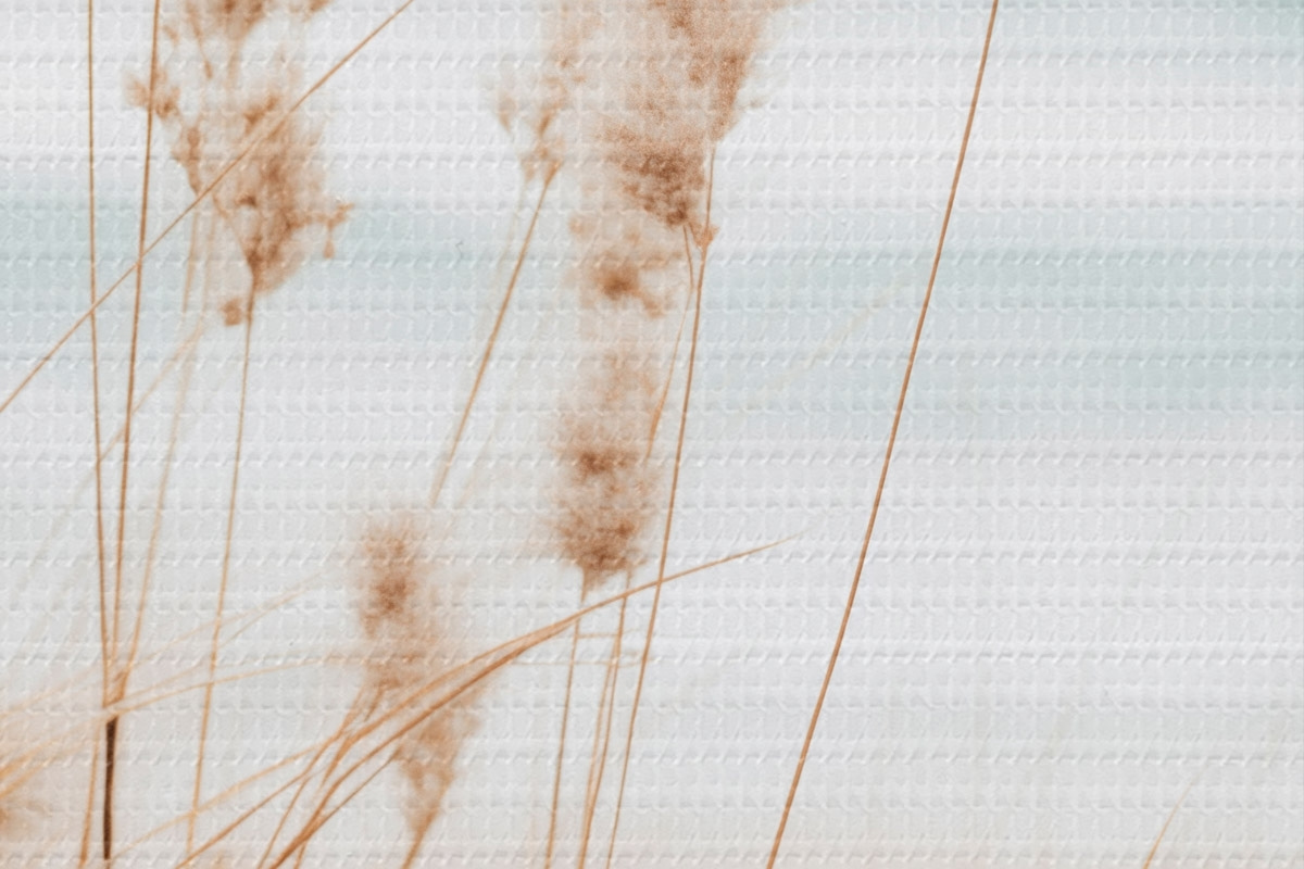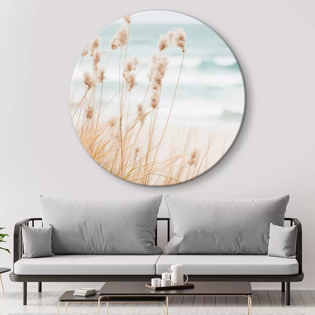 Okrągły obraz Wysoka trawa z puszystymi główkami nasion, piaszczysta plaża i fale oceanu w tle, miękka i stonowana paleta kolorów Nr r45561