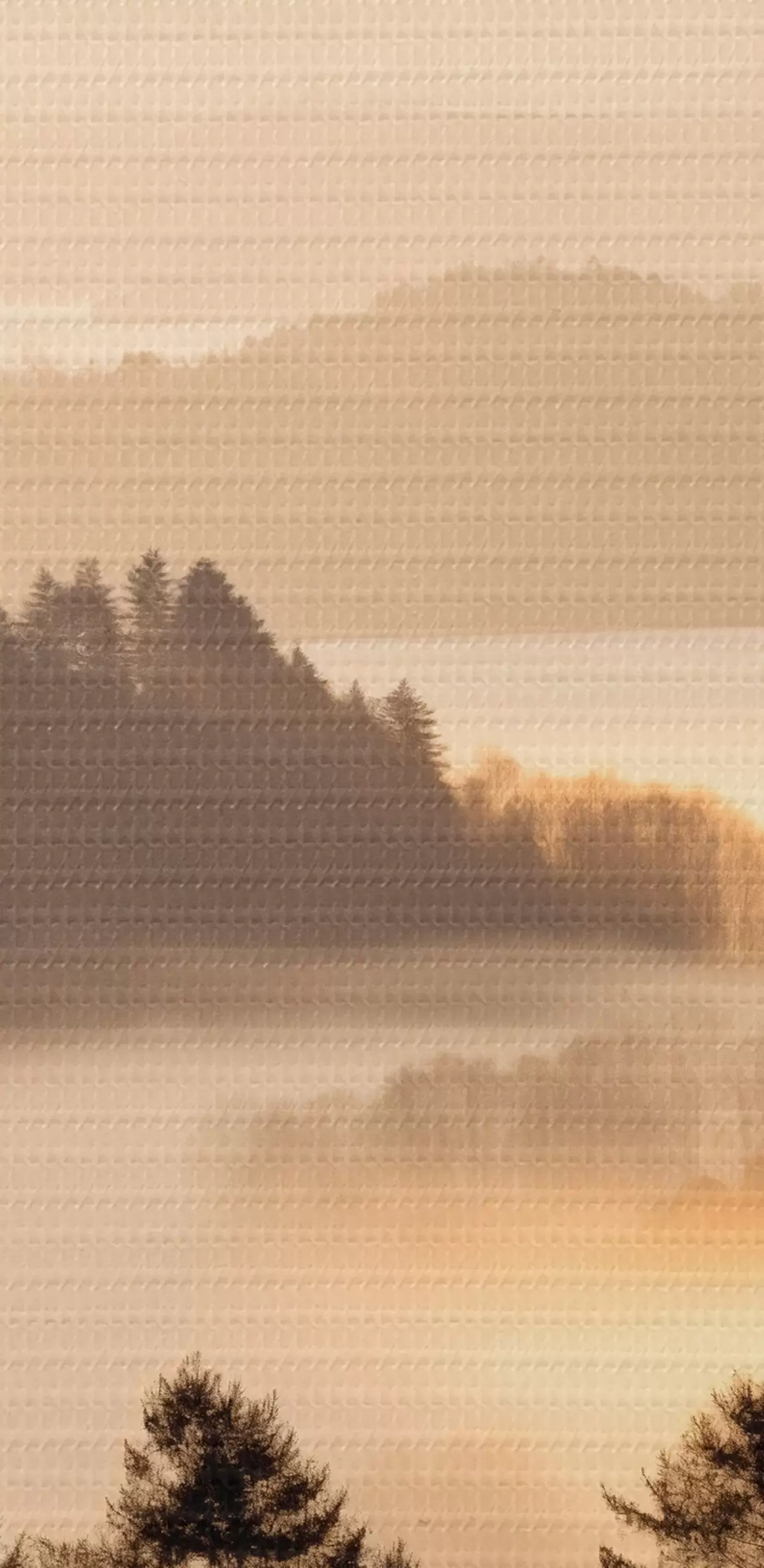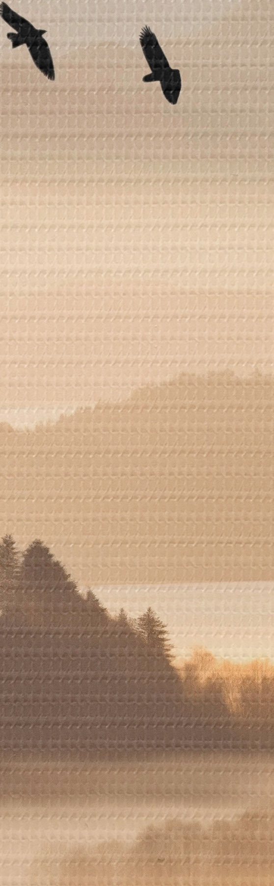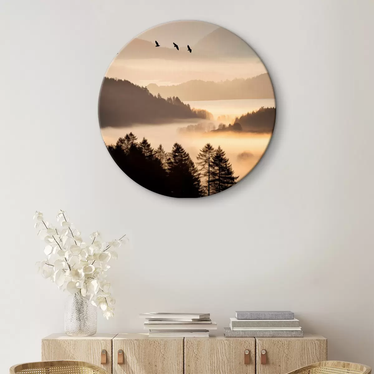 Okrągły obraz Górski krajobraz z lasem i ptakami latającymi na niebie, wszystko pokryte grubą warstwą mgły podczas wschodu słońca Nr r45564