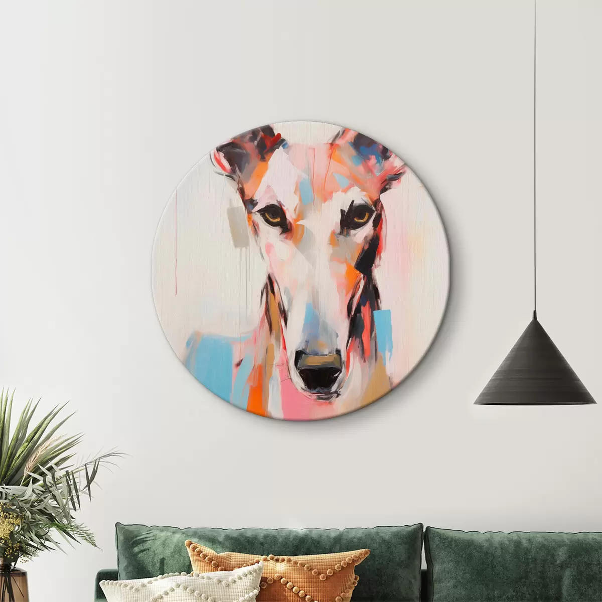 Okrągłe obrazy Pies rasy chart, pomalowany na żywe kolory, takie jak pomarańczowy, różowy i niebieski, na białym tle r45565
