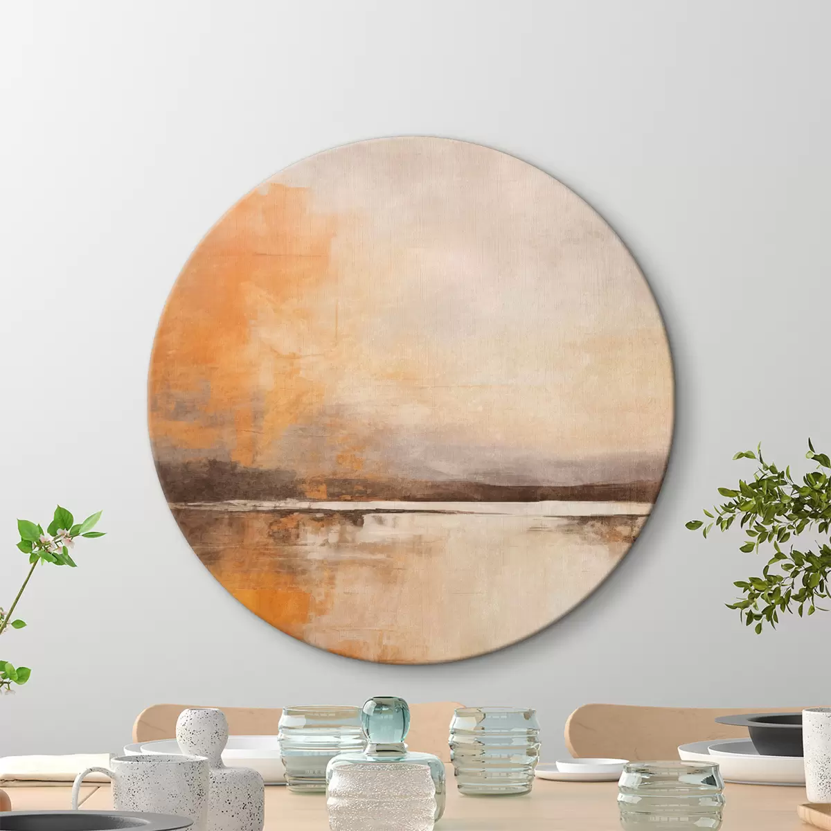 Okrągłe obrazy Abstrakcyjny, teksturowany krajobraz w odcieniach pomarańczy, brązu i beżu r45568