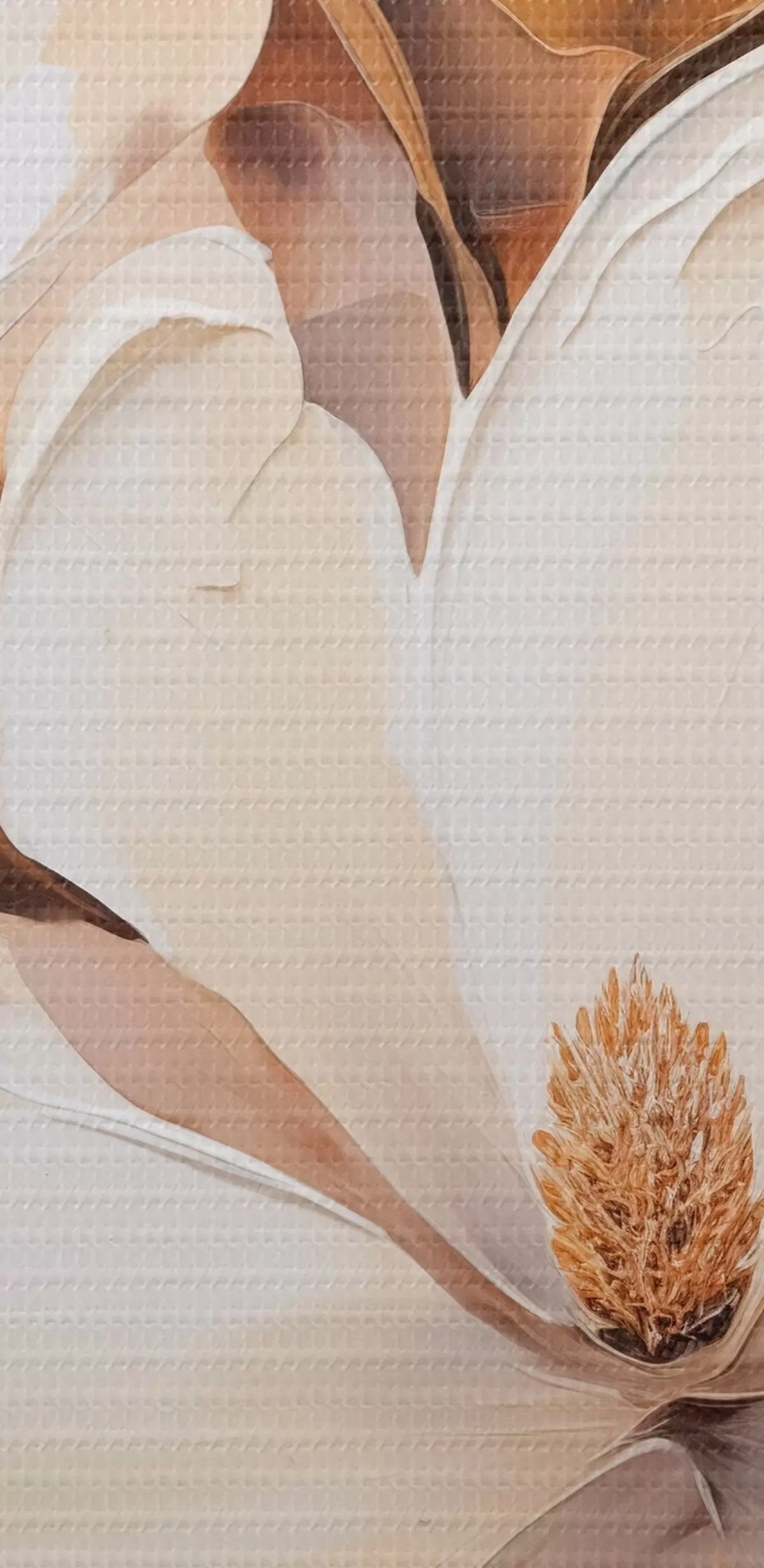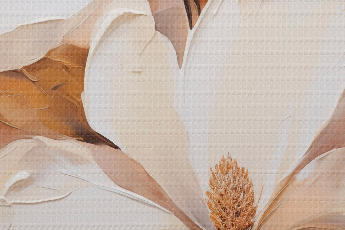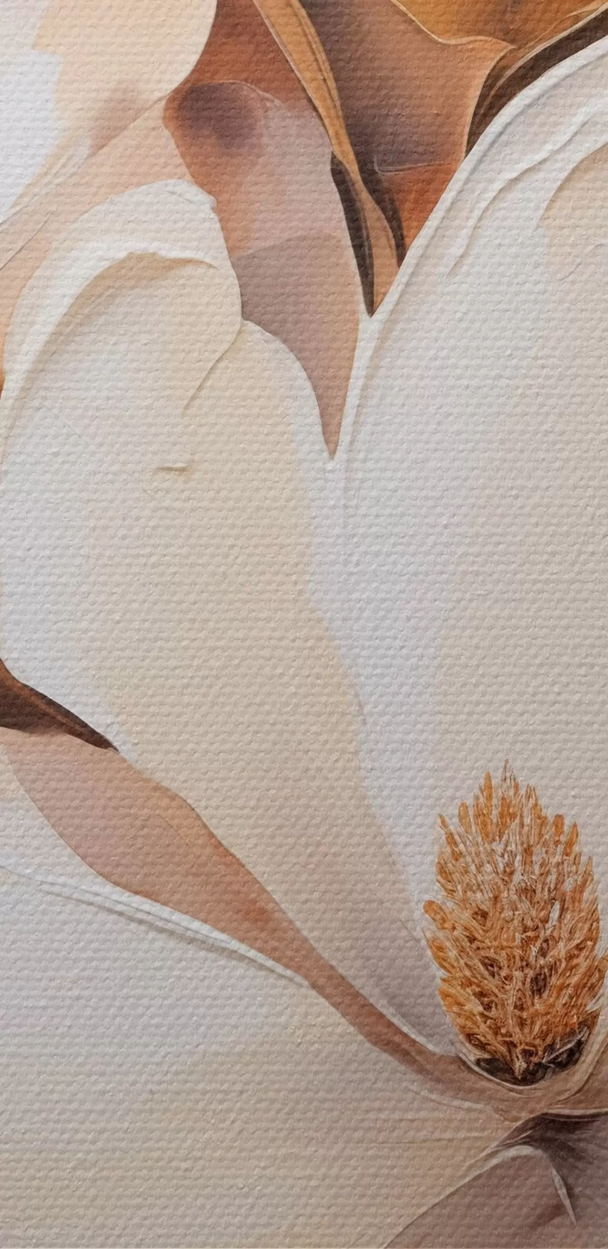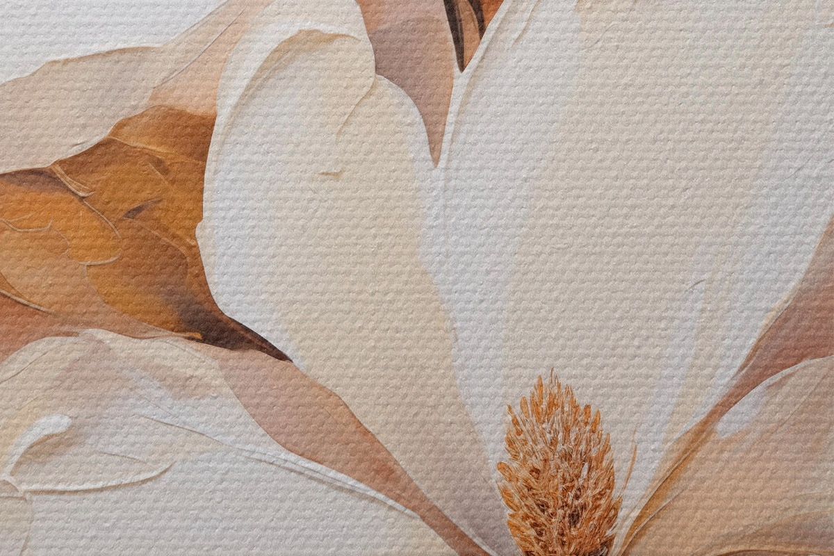 Okrągły obraz Białe kwiaty magnolii na miękkim, rozmytym tle w odcieniach beżu i brązu, styl malarski Nr r45572