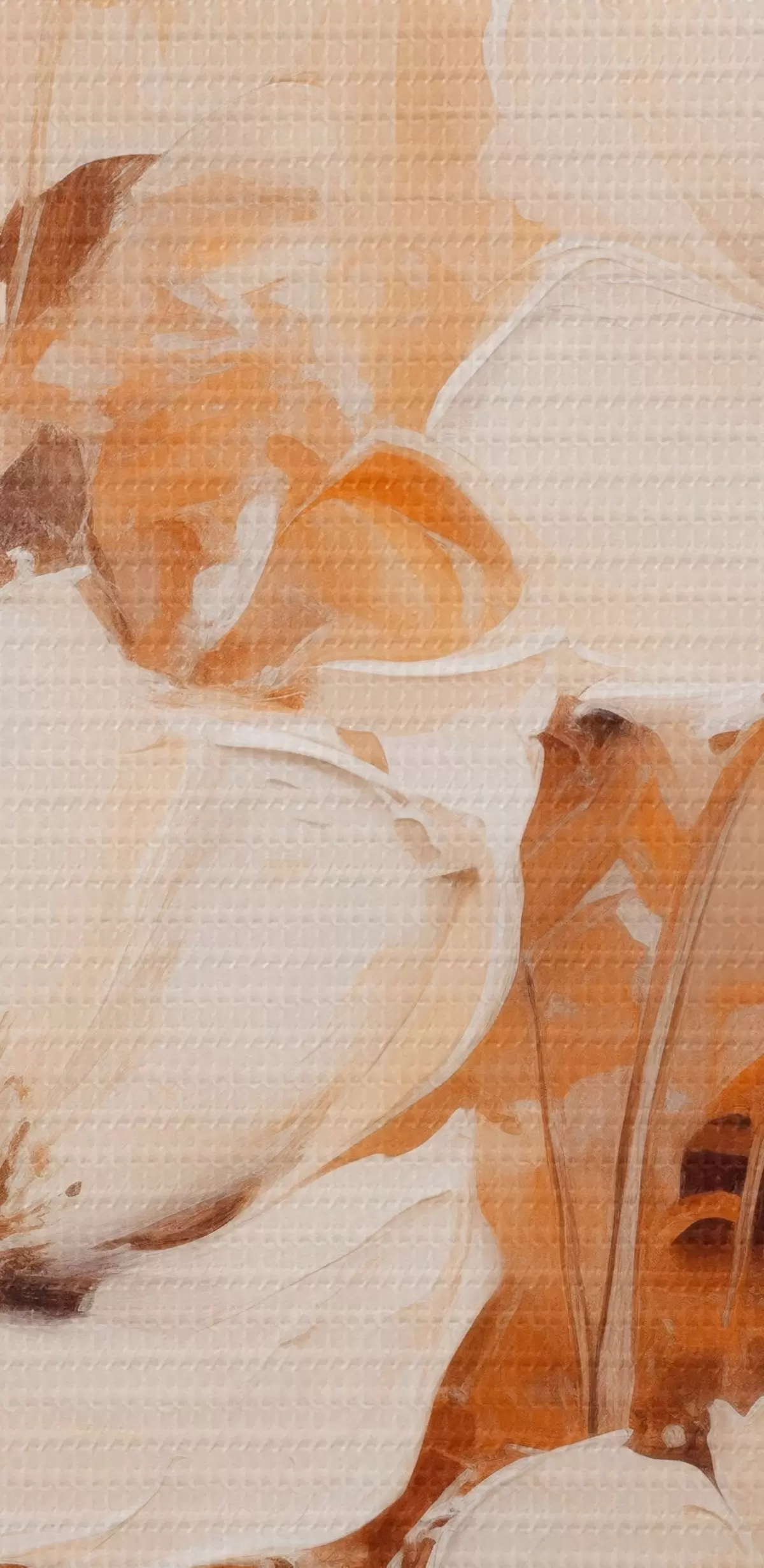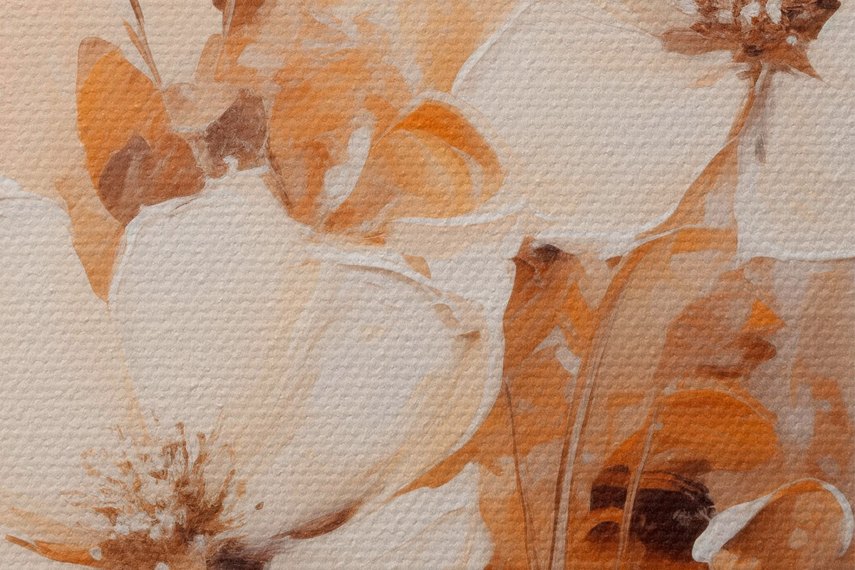 Okrągły obraz Białe kwiaty z pomarańczowymi liśćmi, delikatne pociągnięcia pędzla, ciepła paleta kolorów, elegancka kompozycja Nr r45573