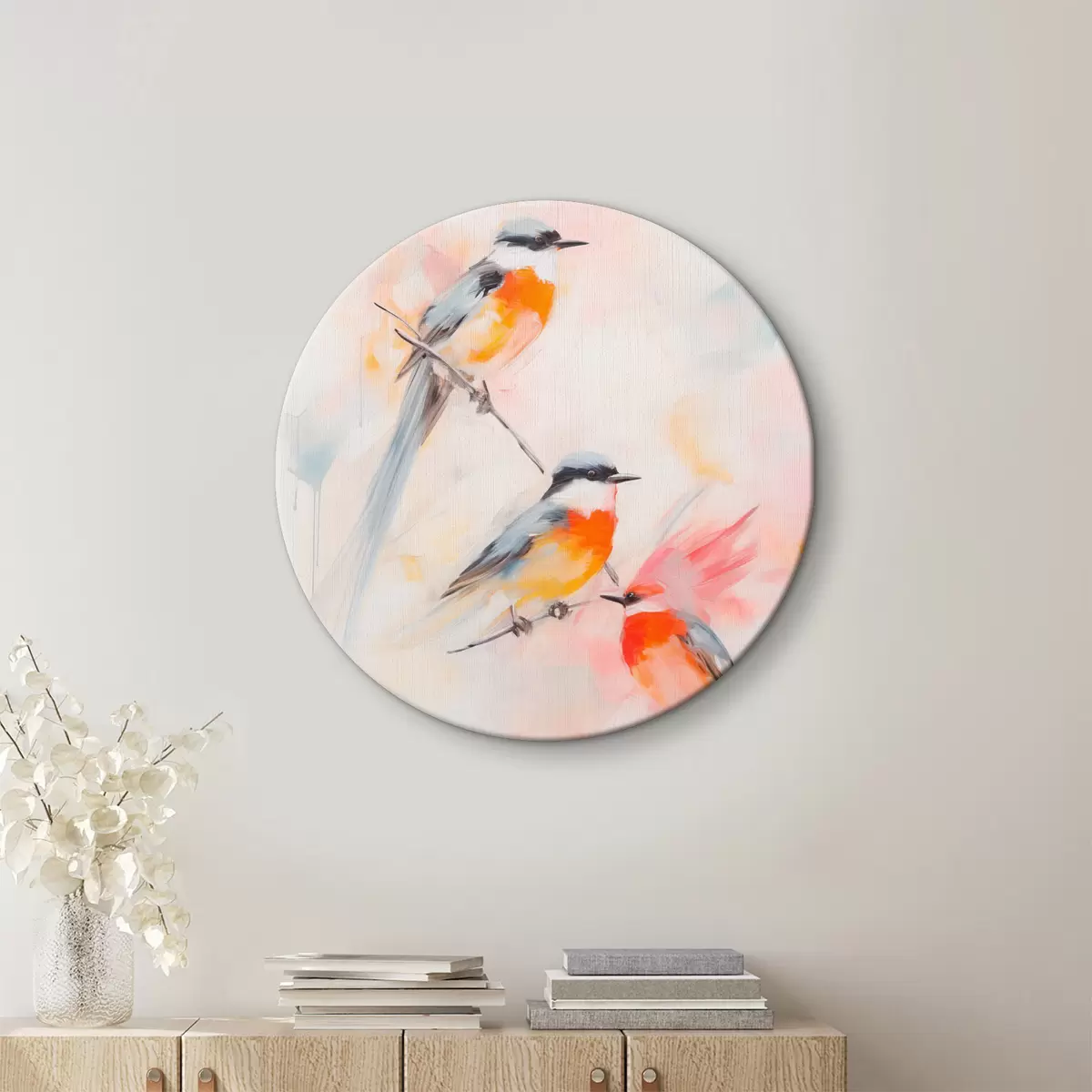 Okrągłe obrazy Ptaki siedzące na gałęziach, delikatne pastelowe kolory, jasne tło z różowymi i białymi odcieniami r45577