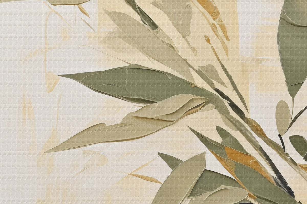 Okrągły obraz Botaniczna gałąź z zielonymi liśćmi na ciepłym tle Nr r45690