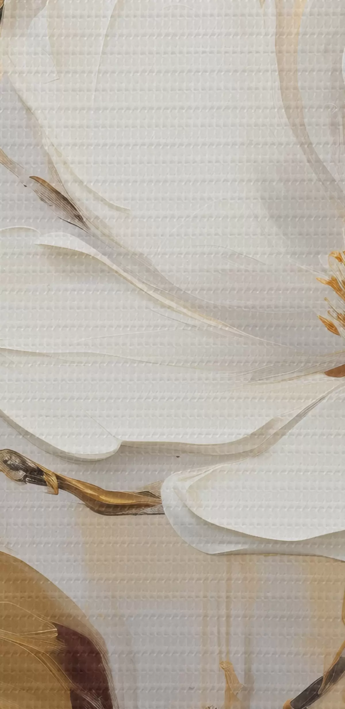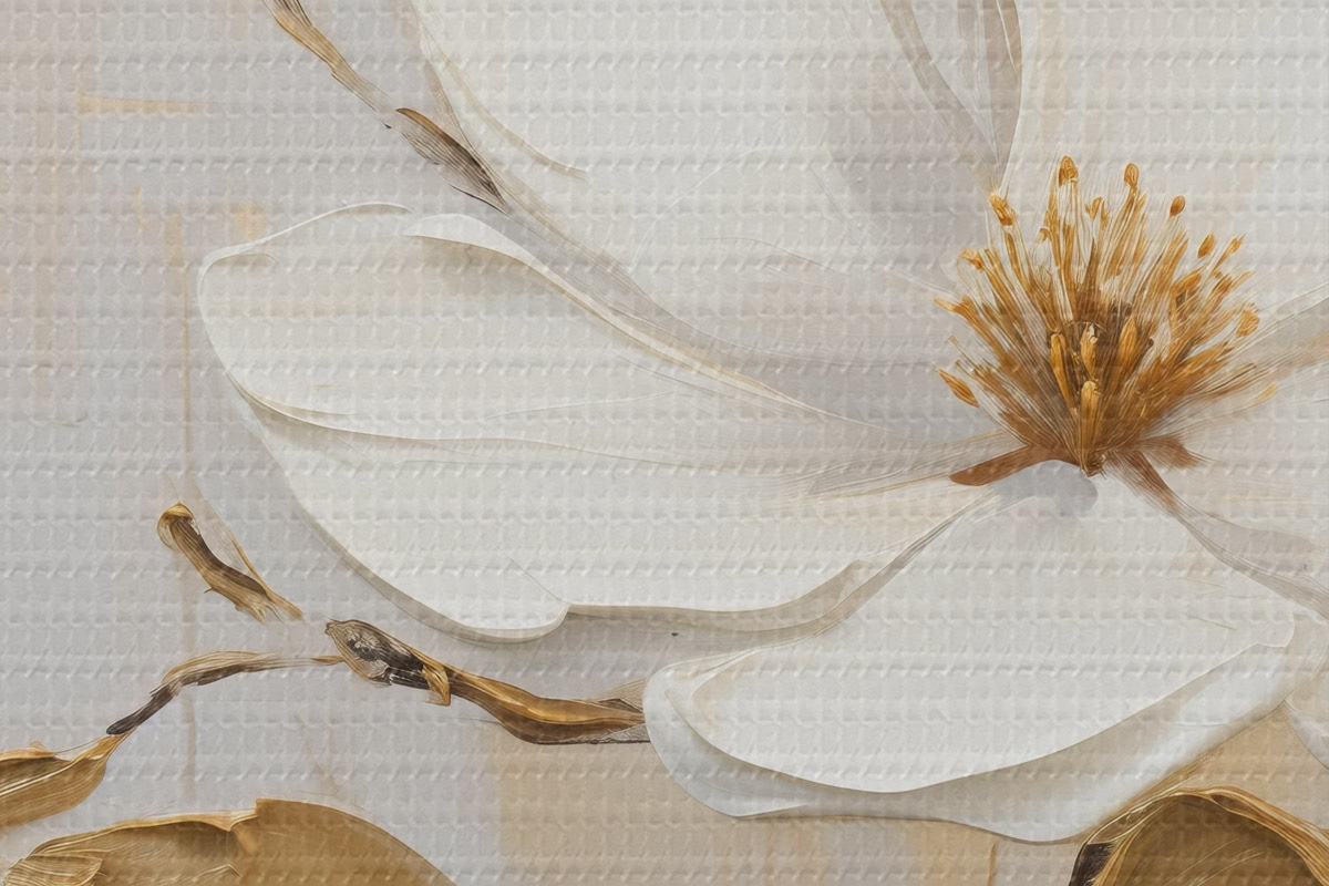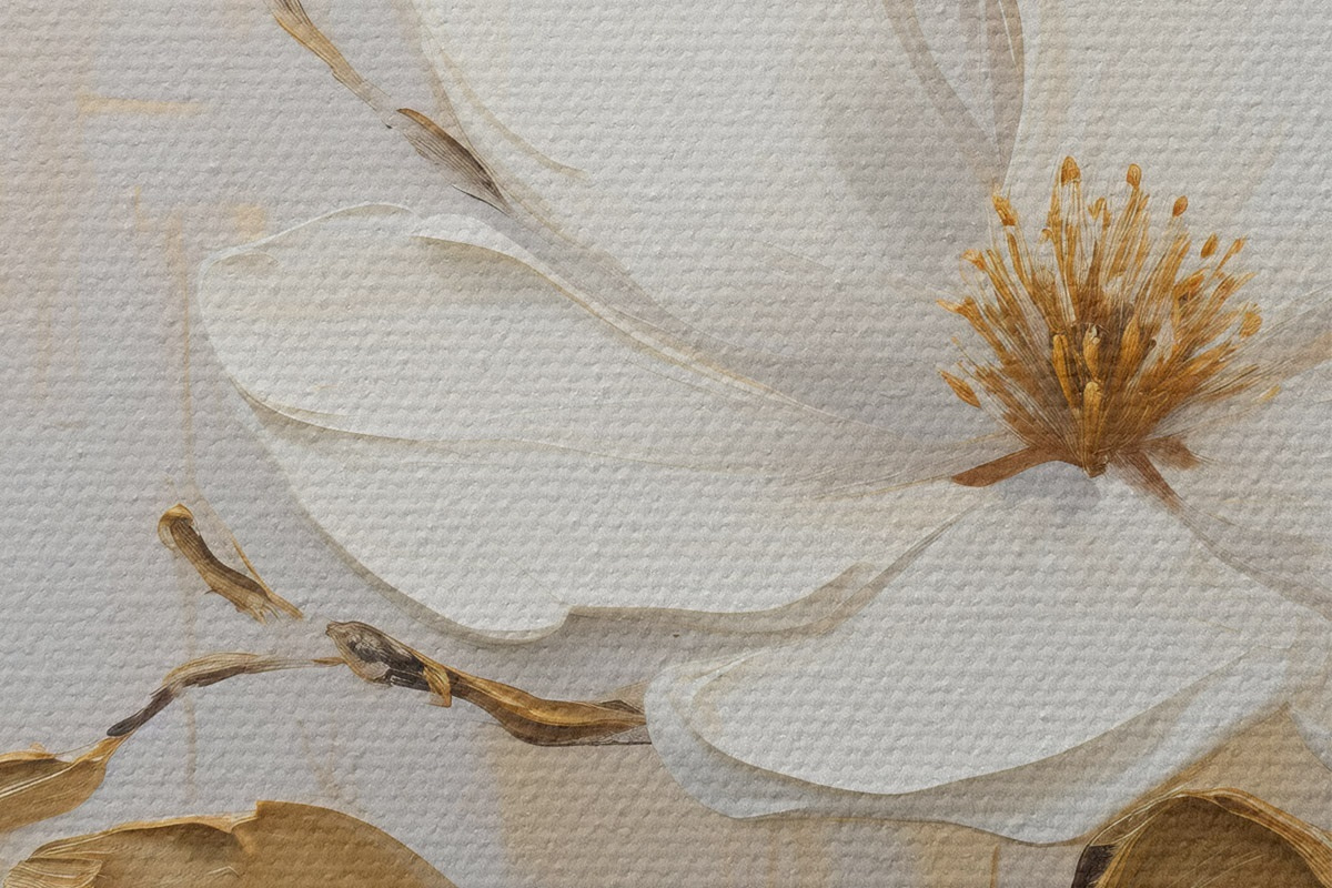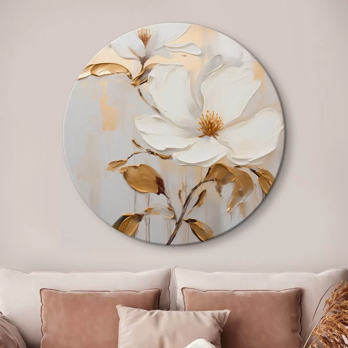 Okrągłe obrazy Dwa białe kwiaty z żółto-pomarańczowymi liśćmi na jasnym tle r45691