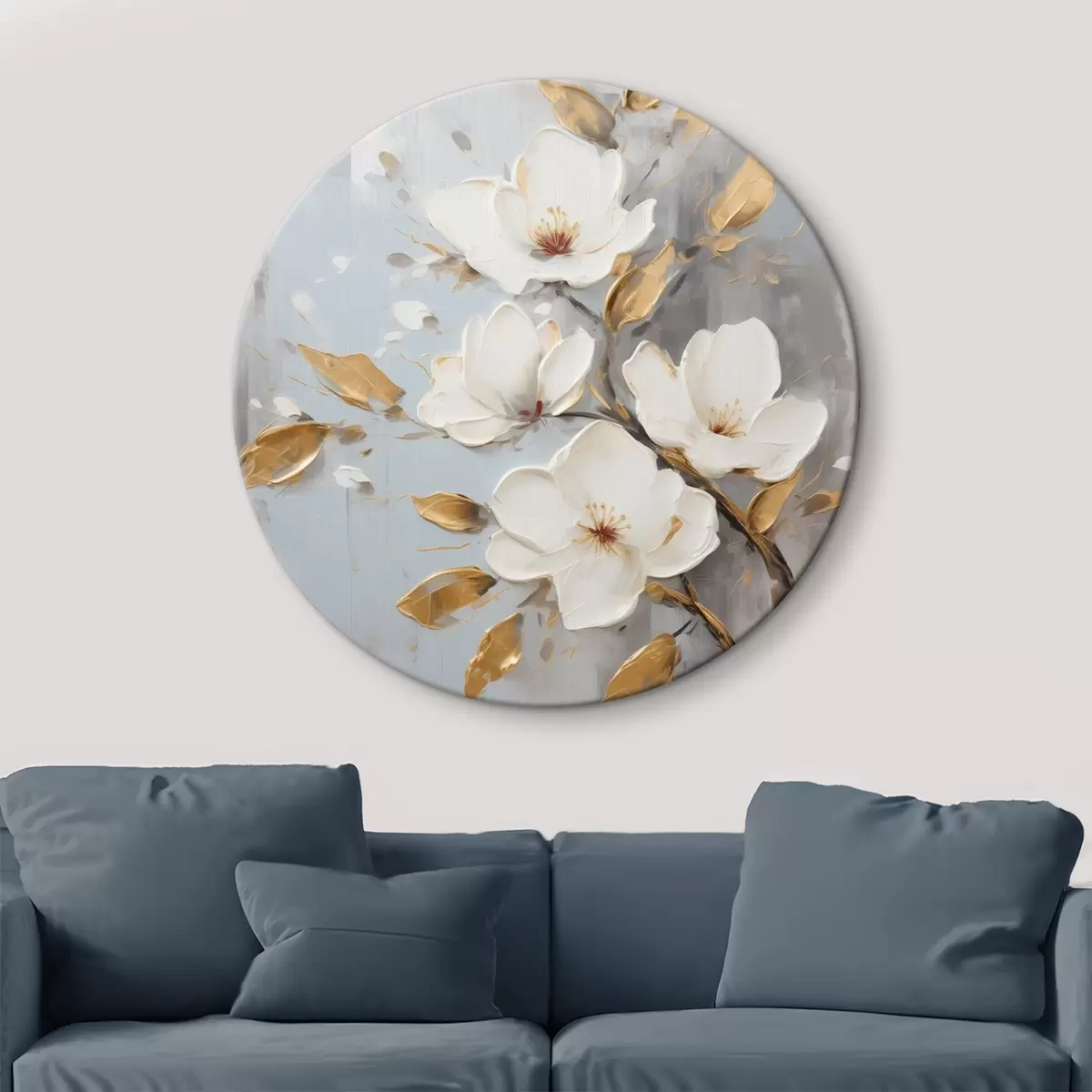 Okrągły obraz Gałązka z białymi kwiatami i żółto-pomarańczowymi liśćmi Nr r45692