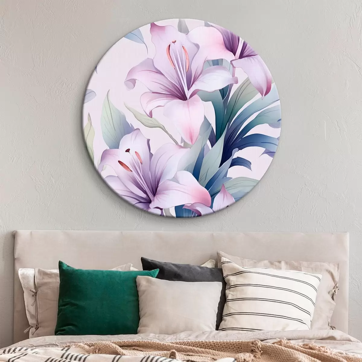 Okrągły obraz Duże różowo-fioletowe lilie z zielonymi liśćmi Nr r45698