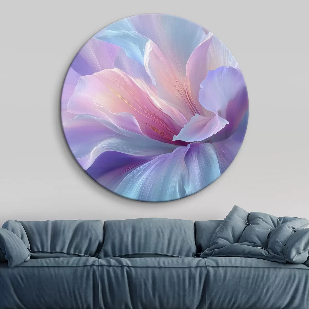 Okrągły obraz delikatny, fantazyjny kwiat o płatkach w odcieniach fioletu, błękitu i różu. Nr r45710