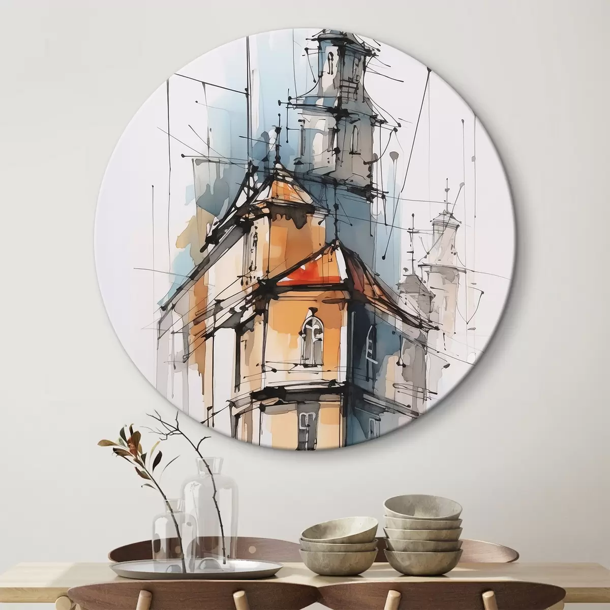 Okrągłe obrazy Dom imitacja szkic i akwarela r45765